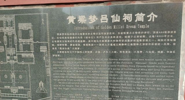 这一古建筑群占地1.3万平方米,殿宇房舍180余间,依唐代沈既济传奇《枕中记》而建,欲称卢生庙、邯郸古观,汤显祖《临川四梦》之一,始建于北宋初期,是华北地区影响较大的千年古观。 黄粱美梦成语和毛泽东诗词一枕黄粱再现均出于此。相传卢生遇神仙,做黄粱美梦就在此地。黄粱梦吕仙祠属于闻名的宗教旅游资源。