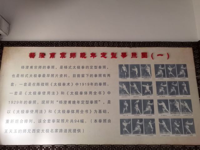 宗师杨露禅(1799-1872),是太极拳运动中兴代表人物,他先后用了二十年时间,三下陈家沟学得太极拳精髓,粘黏走化,引进落空,千变万化,神出鬼没,达随心所欲的境界。从此,太极拳由不为人所知到为人颂扬,由秘不示人到广为传播。王公贵族、文人学士也纷纷投师门下。为适应这些人群的需要,杨露禅删改陈式老架中发劲、跳跃等难度大的动作,创编了一套架势舒展大方、动作圆润、柔中有刚的“绵式”套路。后由其子杨健侯、杨班侯和其孙杨澄甫修润定型,形成了当今流传最广的杨式太极拳。