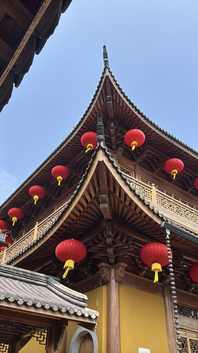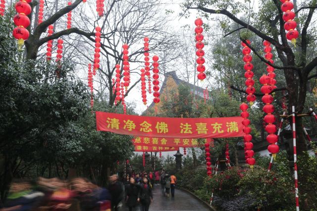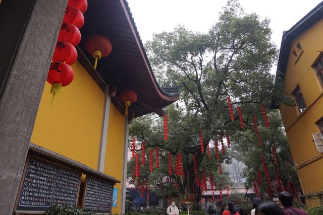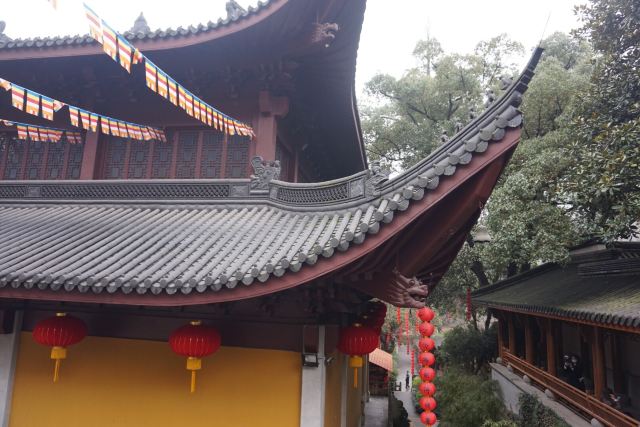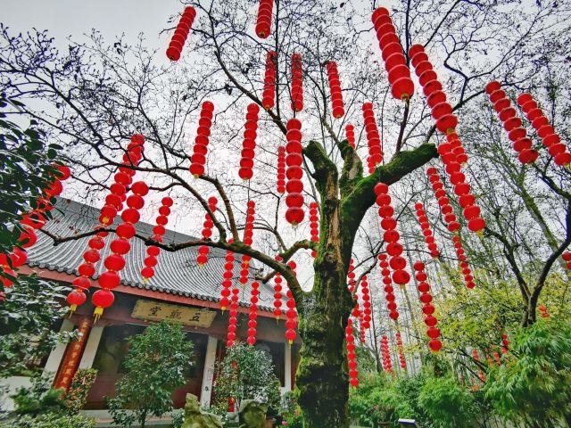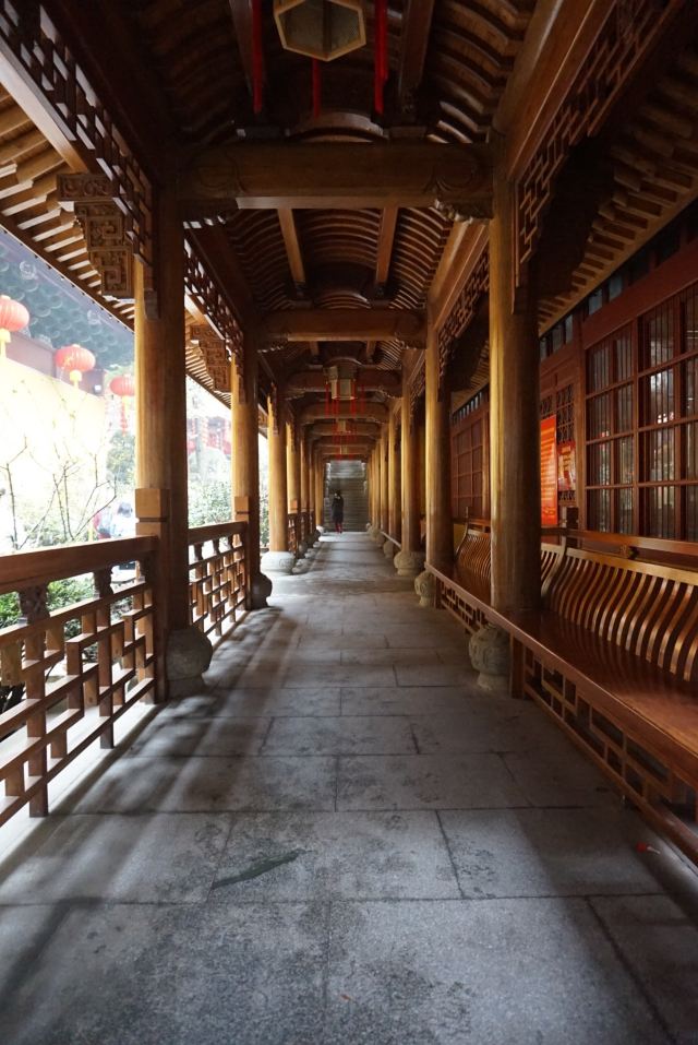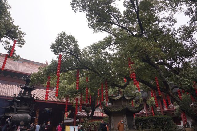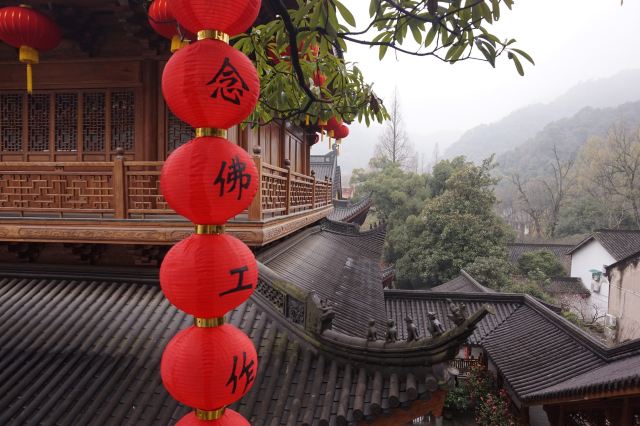 相比杭州其他寺庙,法喜寺的一大看点便是红灯笼。不管是院子里的树木,还是庙宇的飞檐,都挂着八个一串的红灯笼,印着不同的佛门箴言。晴天的时候,阳光打在上面,显得分外喜庆。整个寺院的规模很大,从山门开始层层向上,一殿更比一殿高。站在长廊和大殿间的平台上,可以看到楼宇重重,远山如黛,意境极好。然而,不知道从什么时候开始,这个角度居然成了网红,游客们纷纷打卡留念。