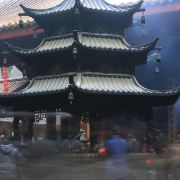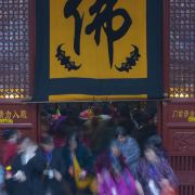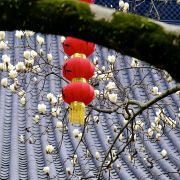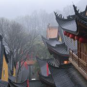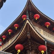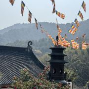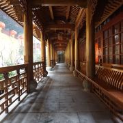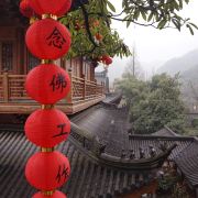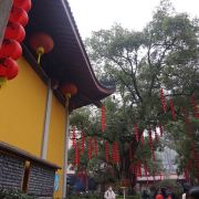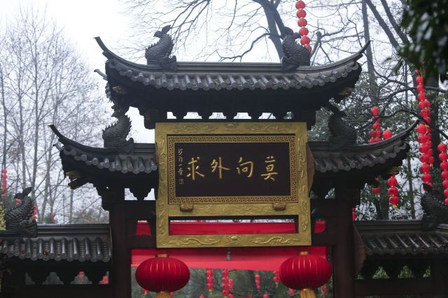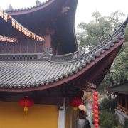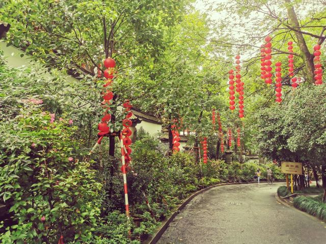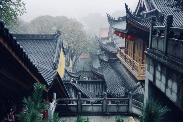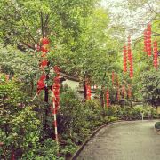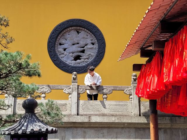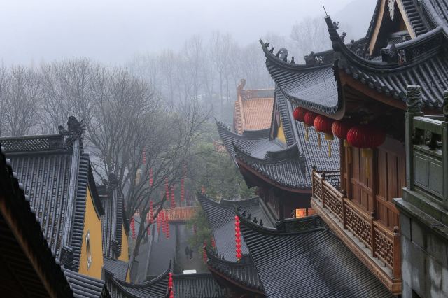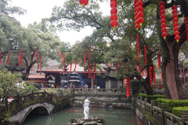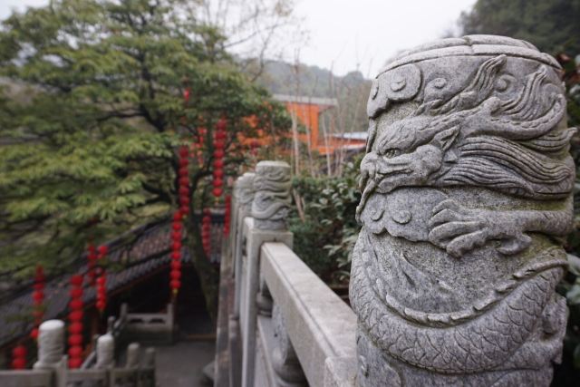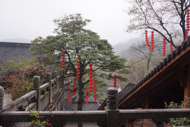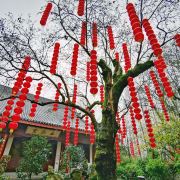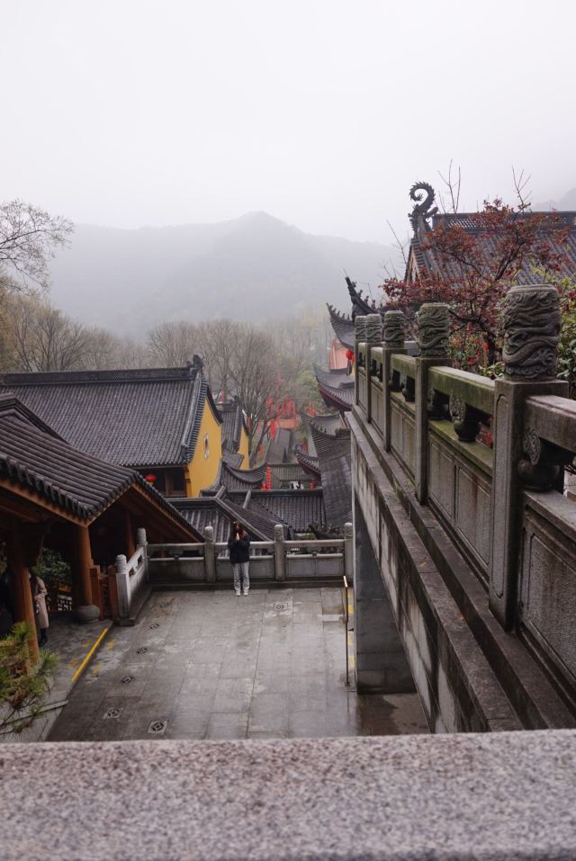相比杭州其他寺庙,法喜寺的一大看点便是红灯笼。不管是院子里的树木,还是庙宇的飞檐,都挂着八个一串的红灯笼,印着不同的佛门箴言。晴天的时候,阳光打在上面,显得分外喜庆。整个寺院的规模很大,从山门开始层层向上,一殿更比一殿高。站在长廊和大殿间的平台上,可以看到楼宇重重,远山如黛,意境极好。然而,不知道从什么时候开始,这个角度居然成了网红,游客们纷纷打卡留念。