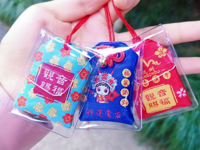 法喜寺是怎么火起来的?最先大概是那些杭儿风的文创产品吧。“我佛尽该喜欢你”、“脱单天注定”……之类的词眼印在各式御守和帆布包上,极具时尚元素和杭州本土特色,一时间卖断了货。这些产品哪里买?寺庙周边的文创小店,西湖景区里的一些小店也有。最近这次去法喜寺,山门口有个卖盲盒的亭子,盲盒包装盒的图案实在太萌,“心有法喜”、“莫向外求”,于是买了一个,里面有明信片和零钱包,还不错哦。