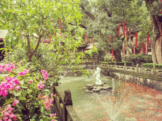 法喜寺内,环境优美。草木青翠,鲜花绽放,池水碧波,黄墙黛瓦,灯笼遍布。自然之灵犀,禅意在缭绕。