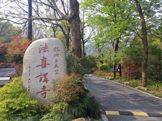 到达法喜寺的常规路线有两条。走的人最多的,便是天竺路。顺着天竺路一直往高处(西南方向)走,路的尽头,天竺路338号便是法喜寺,有那么点西天取经问道的感觉。还有一条比较小众,就是从安缦法云和杭州佛学院前过,穿过天喜山下的大竹林,过中印禅寺,再到法喜寺。这条路有上有下,曲径通幽,别有野趣。