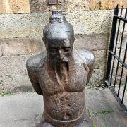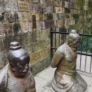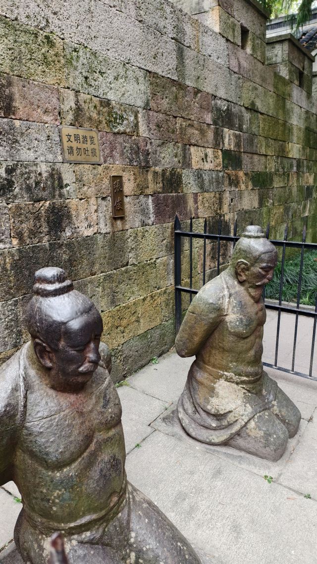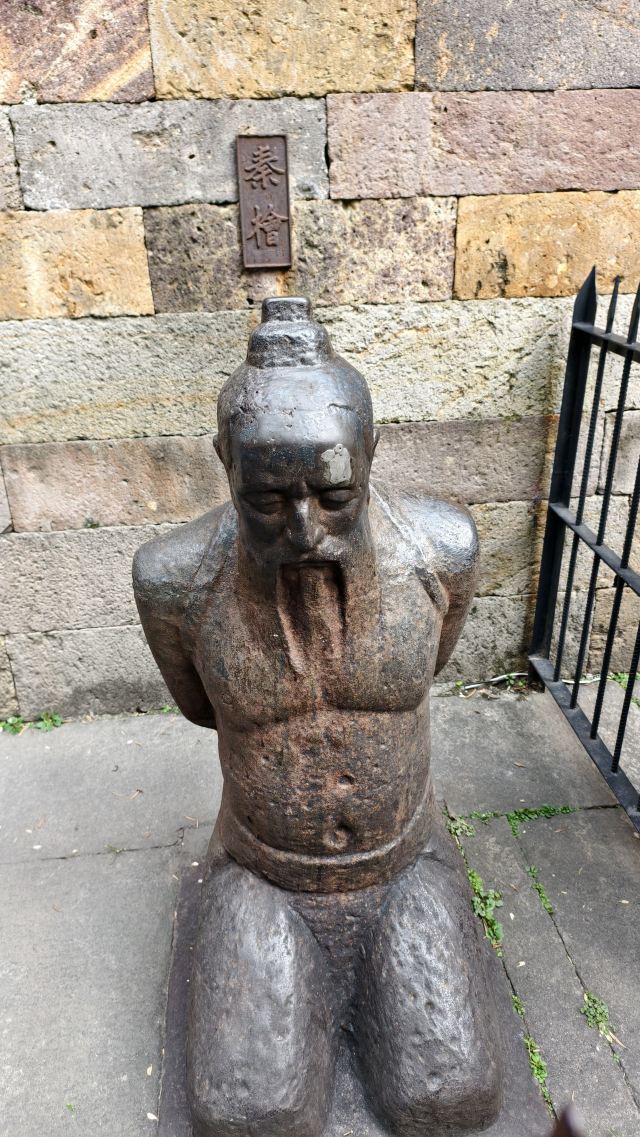 参观完正殿返回院落,往西走经过碑廊,过精忠桥便来到墓园区,这里一大一小是岳飞和儿子岳云的墓。正对着岳墓的是一座拱门,门的两侧各有一对铁铸的奸臣跪像,他们面对着岳飞墓,跪着向岳飞请罪,左侧的便是秦侩和夫人王氏。过去人们来到这里,除了瞻仰民族英雄,还有一件重要的事便是到这两对跪像面前吐口水。如今,吐口水已经不被允许,旁边的墙壁上也挂着“文明游览,请勿吐痰”的标语。