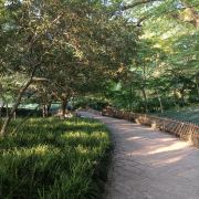 从苏堤对面的东门进去,不远就是一块大草坪,每天早上都有不少人来此晨练。草坪上有一座充满异域风情的大风车,是太子湾公园的标志。从这里开始,沿着公园内的栈道往西走,一路都是郁郁葱葱的树林和花花草草,还有蜿蜒而过的溪水、石桥,景色非常美。公园西侧还有一座小教堂,俏皮又浪漫。和家人朋友一起来这里散步、拍照,或者随意走走逛逛感觉非常好。