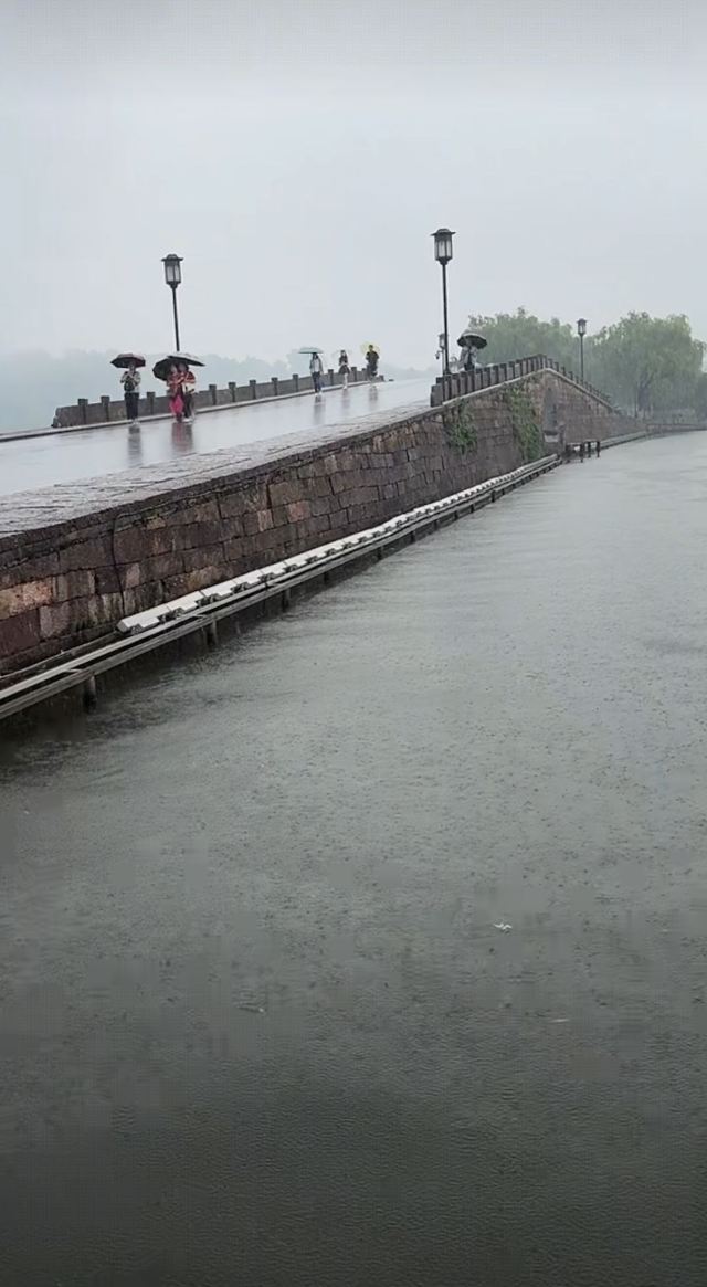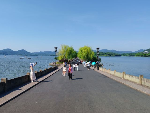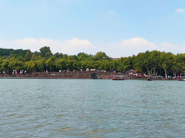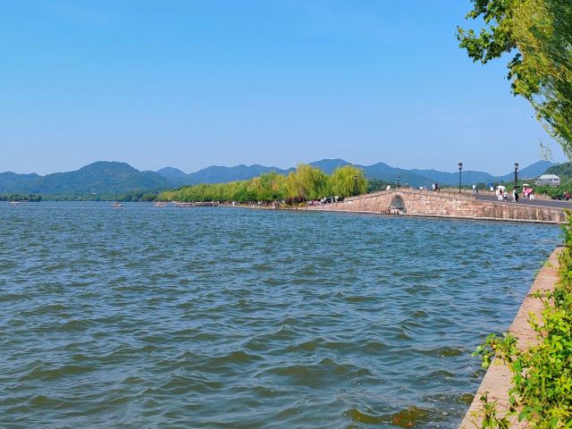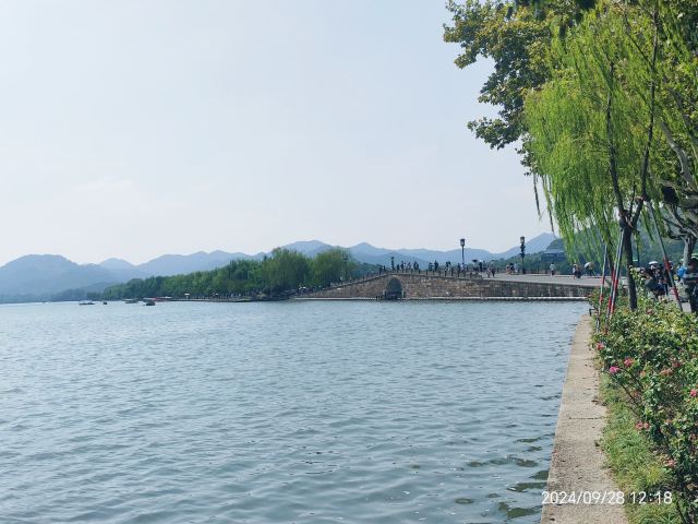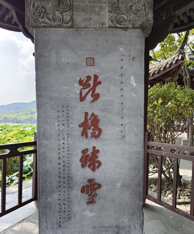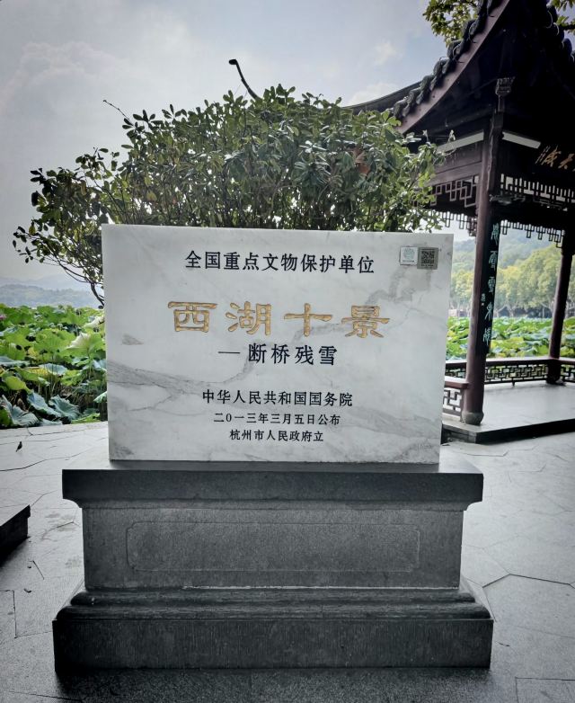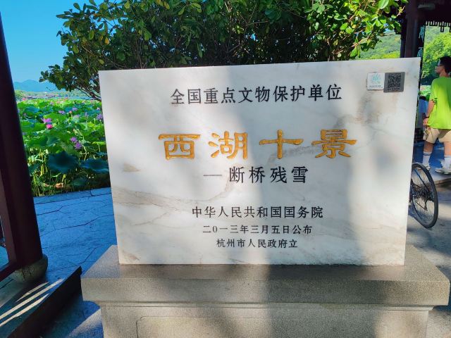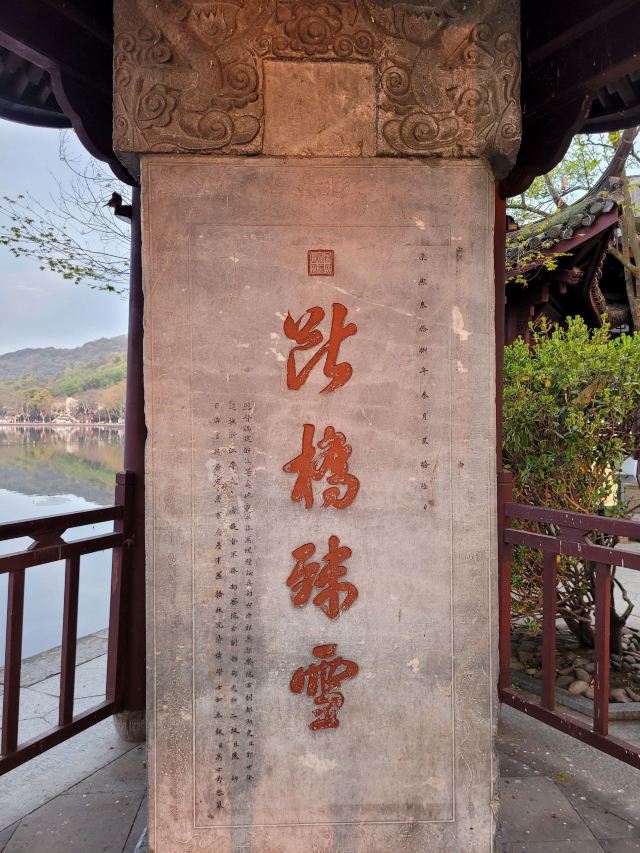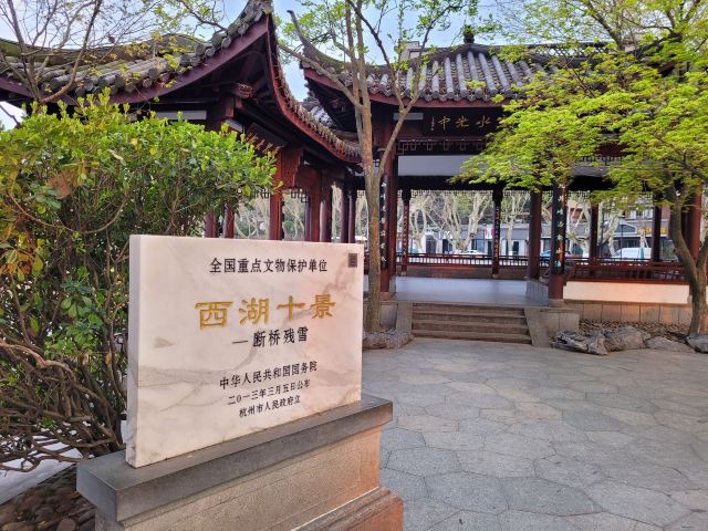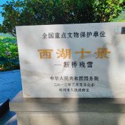 断桥景致较好的时候是冬日雪后,此时桥的阳面冰雪消融,但阴面仍被残雪覆盖,从高处看,桥似断非断,这就是有名的“断桥残雪”,也是较早的“西湖风景名胜区十景”之一。不过,想要看到“断桥残雪”的景观还是需要几分运气的,杭州很少下雪,而有积雪的时候游人也并不会少。所以除非大雪过后赶早去,不然看到的可能只有雪水和脚印了。断桥也是赏西湖雪景的佳处,站在桥上放眼望去,远山近水尽收眼底,你会发现银装素裹的西湖风景名胜区比其他时候多了几分冷艳。