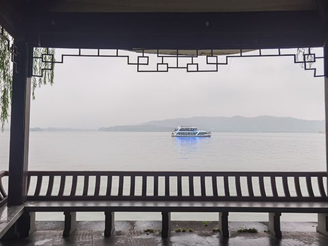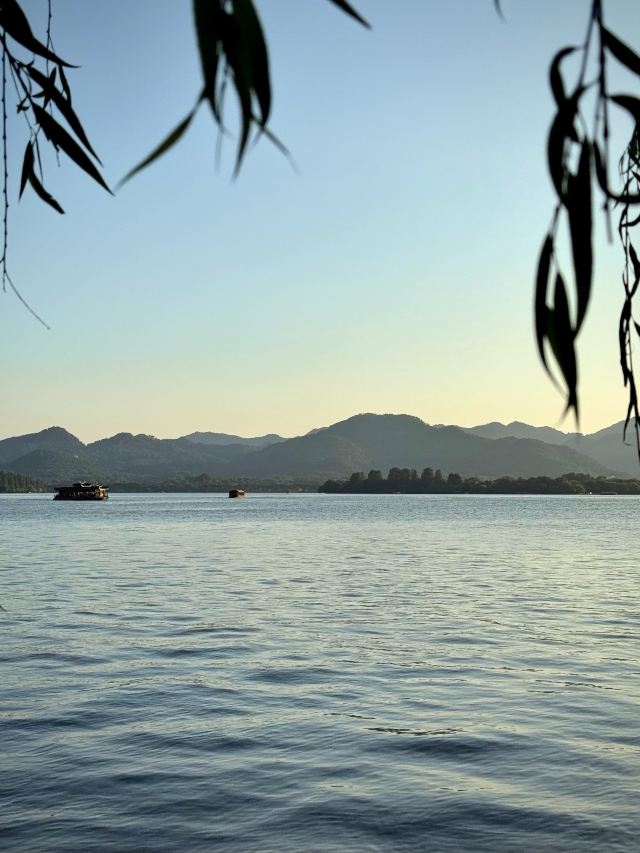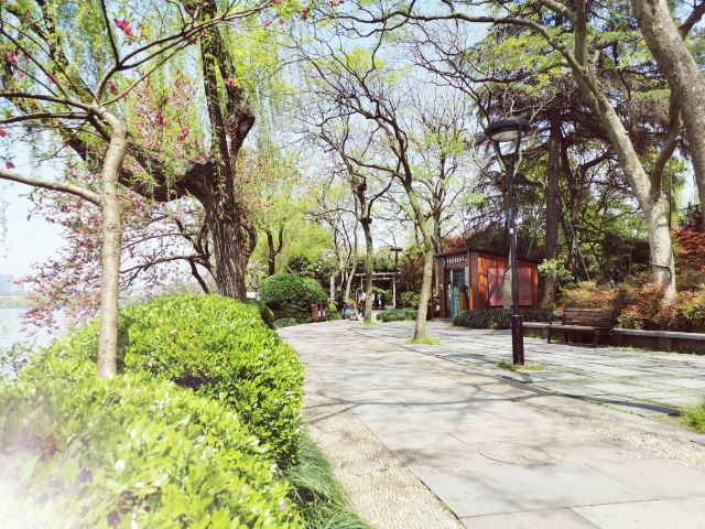 最后来到柳浪闻莺,坐在湖畔的长椅上,看西湖碧波荡漾,游船缓缓驶过,一枝杨柳一枝桃花,花开灿烂绿如茵,春风拂面,春光旖旎。