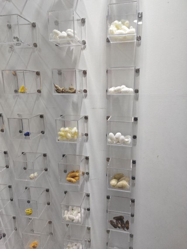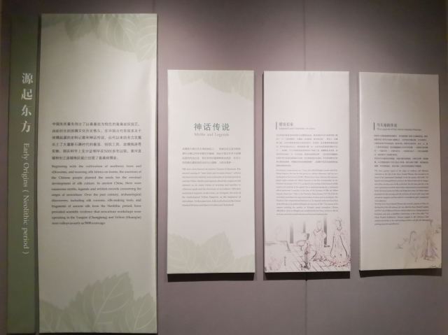 楼上开始“弘扬古蚕绢文化,开拓新丝绸之路”。主厅讲述的是一个关于中国丝绸的故事,主要讲述丝绸的起源和发展、丝绸的主要种类、丝绸之路及丝绸在古代社会生活中占据的地位。染织厅和现代成就厅分别展示了古代织机发展的历程和新中国成立后我国在丝绸方面的成就。
