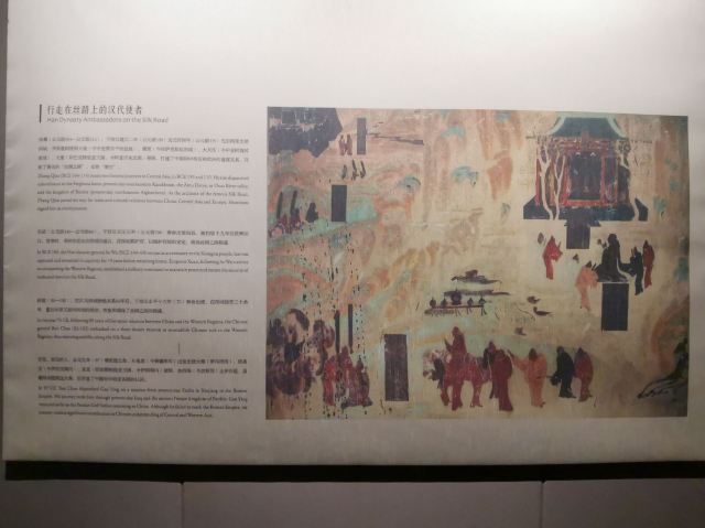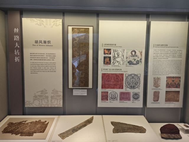 丝绸之路连廊通过大型古代丝绸之路地图和丝路出土的汉唐织物珍品的展示,再现了草原陆路丝路、海上丝路等四条丝路的具体走向及新航路开辟后的丝绸之路和它们所带来的中西方文化的交融
