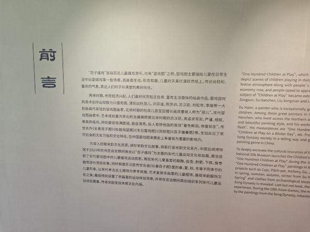 4分 满意赶在在2025年中国丝绸博物馆改造前,来到这里参观一下。一楼是儿童专场,大型“百子嬉戏”图,是指百名儿童嬉戏游乐,也有“婴戏图”之称。婴戏图主要描绘儿童在日常生活中玩耍嬉戏等一些场景,其画面生动,形态有趣,儿童的天真烂漫跃然纸上,传达出轻松,喜庆的气息,表达人们对子孙满堂的美好向往。