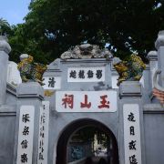 玉山祠位于还剑湖畔小小的玉山岛上,有三重门阙、大殿、廊房等,通过栖旭桥与湖外相连。据记载,越南郑氏王朝曾在玉山岛上建有瑞庆宫和左望亭,后毁于战乱。后来玉山岛上建了道观,1872年重修,规模进一步扩大。