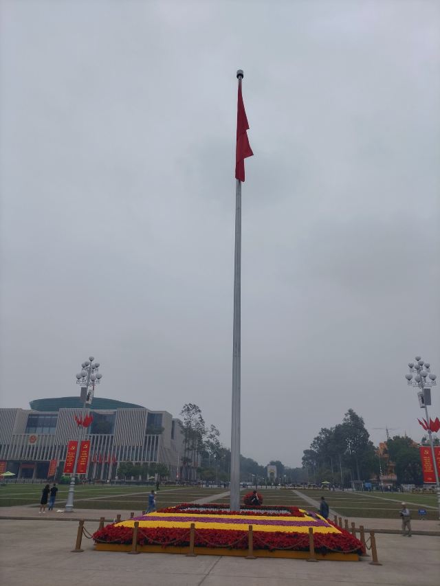 ②越南共产党党部:广场东北侧的建筑内,上面挂着越南国徽,跟中国国徽很类似,只是由5颗星变为1颗星,与国旗的差别相同。越南百姓可以挂国旗,但挂国徽是违法的。