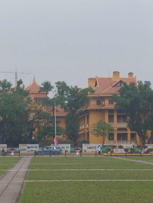 3、胡志明纪念馆位于广场正中央,建于1975年,是一座形似“列宁墓”的方形建筑,很显眼,建筑上两行越南字分别是“主席/胡志明”,称谓在前姓名在后,与我国的称呼语序相反。馆内摆放着存有胡志明遗体的水晶棺,供游客瞻仰,职能与天安门广场上的“毛主席纪念堂”相同,但不巧的是今天正值每年6月14至8月16日遗体维护,很遗憾此次没能入馆看到。