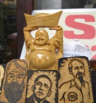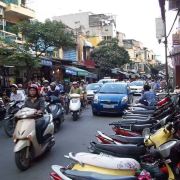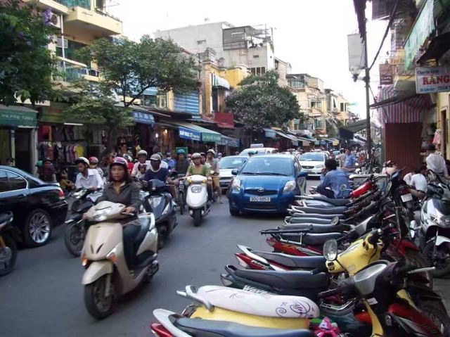 在老城区外下了车,异常的闷热让我大吃一惊,简直像钻进了个大蒸笼,立即汗如雨下,难受极了,后来才知道,当天温度竟达38~40度。并马上见识到越南的一大奇景——马路上密密麻麻、风弛电挚的摩托车大军,的确蔚为壮观!他们的摩托车相当于自行车在我国的地位,自行车倒很少了,不愧为摩托车王国。中心城区内只有少量主干路口设有红绿灯,且相隔很远。面对川流不息的摩托车洪流,如果你想等待车流减弱时再通过,几乎是痴心妄想的,至少我就极少碰到绝对安全的时候,感觉每次通过必须冒着生命危险,命运已完全掌握在摩托车手们的手中了。后来经过几天适应,我终于熟悉了过马路这种技术含量极高的技巧,就是必须胆大、心细,勇敢地往车流中迈出第一步,眼睛直视飞驰而来的车辆,切记匀速步行,千万不能因惊慌失措时快时慢或突然停下,因为车手不会为你而减慢车速,他们会判断你的移动方位从容而漠然地从你身边高速掠过,能确保每个人的车技都如此娴熟吗?即使习惯了,但每过一次马路总免不了心惊肉跳!