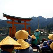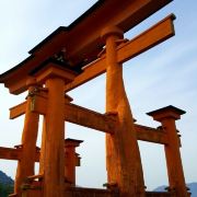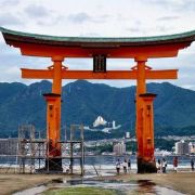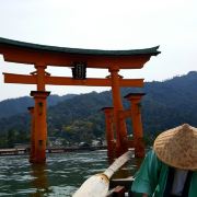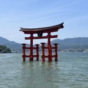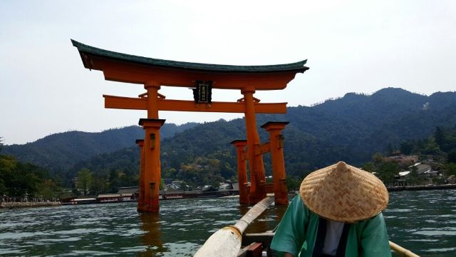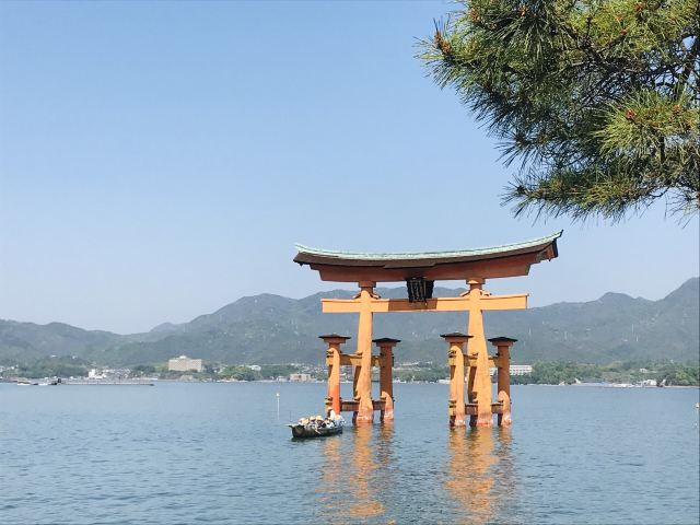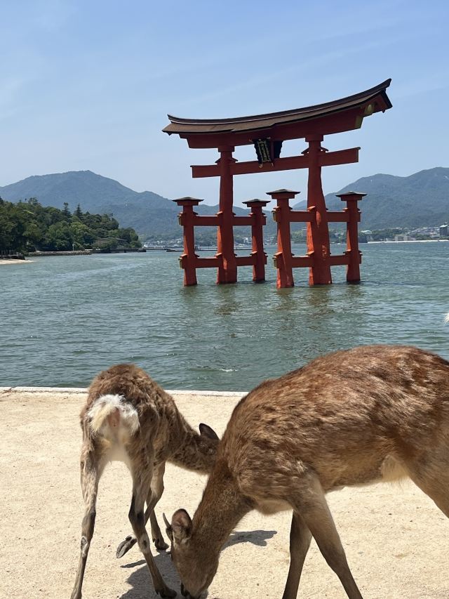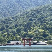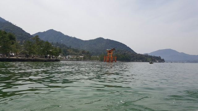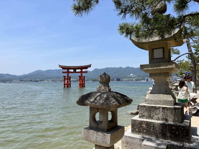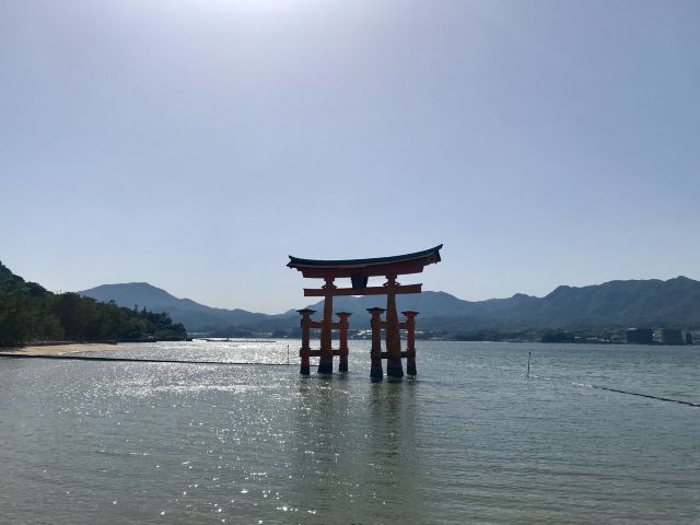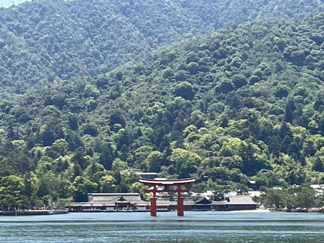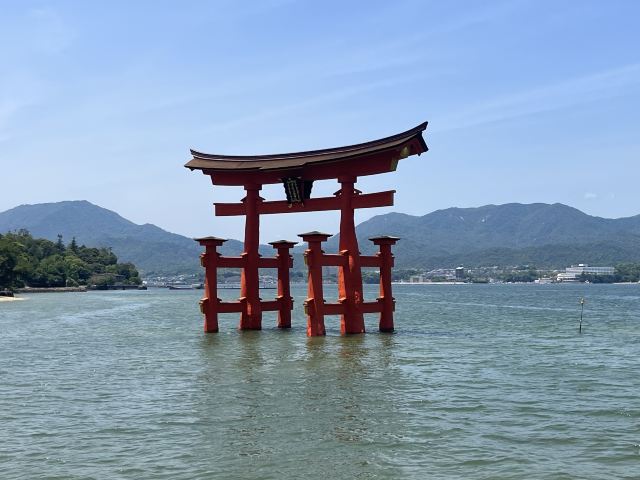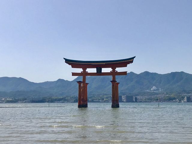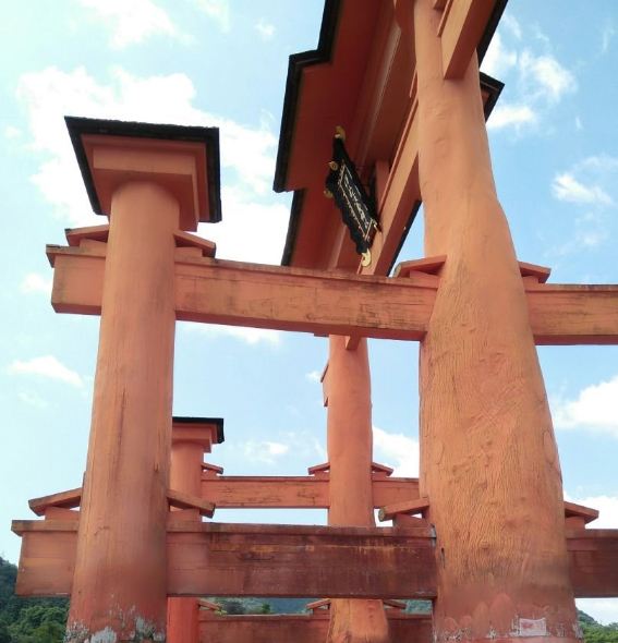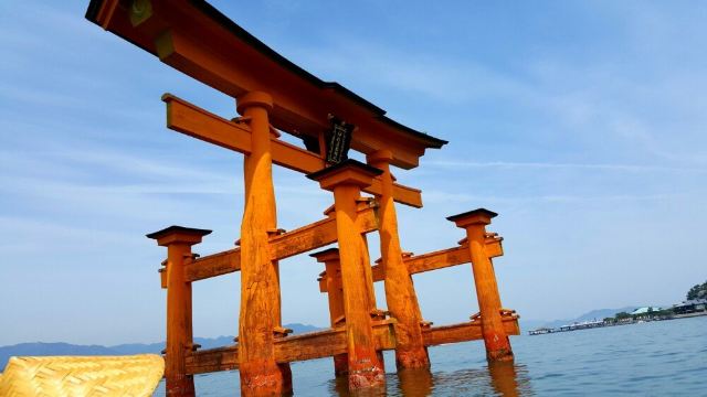 严岛神社前约200米的海中有一座16.6米高的红色大鸟居,是宫岛的标志性景观。当大海涨潮时,被海水半淹着的大鸟居显得神秘而壮观,从严岛神社伸出的舞台“火烧前”来眺望它,景色尤美。待退潮后,更可以直接走到大鸟居的底下去近距离观赏。