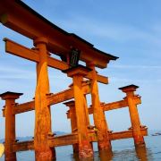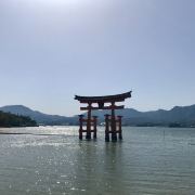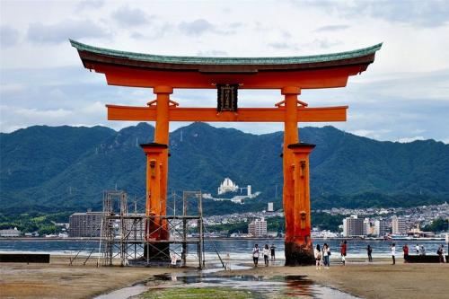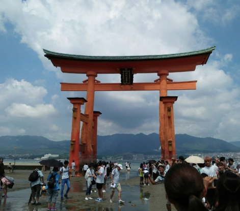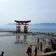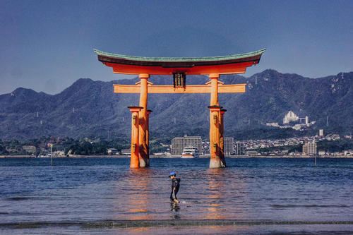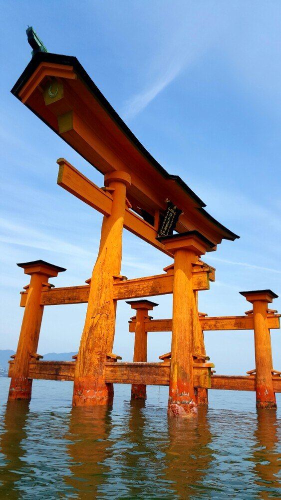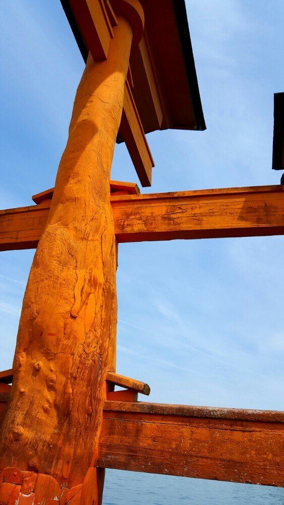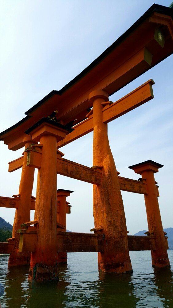 鸟居是立在海里又在海上的,落潮时候还是可以下到海滩,鸟居非常的壮观,如果是原来朱红色的鸟居的话震撼感很强的。