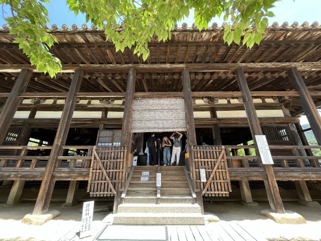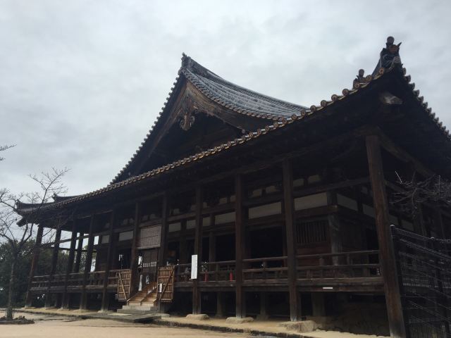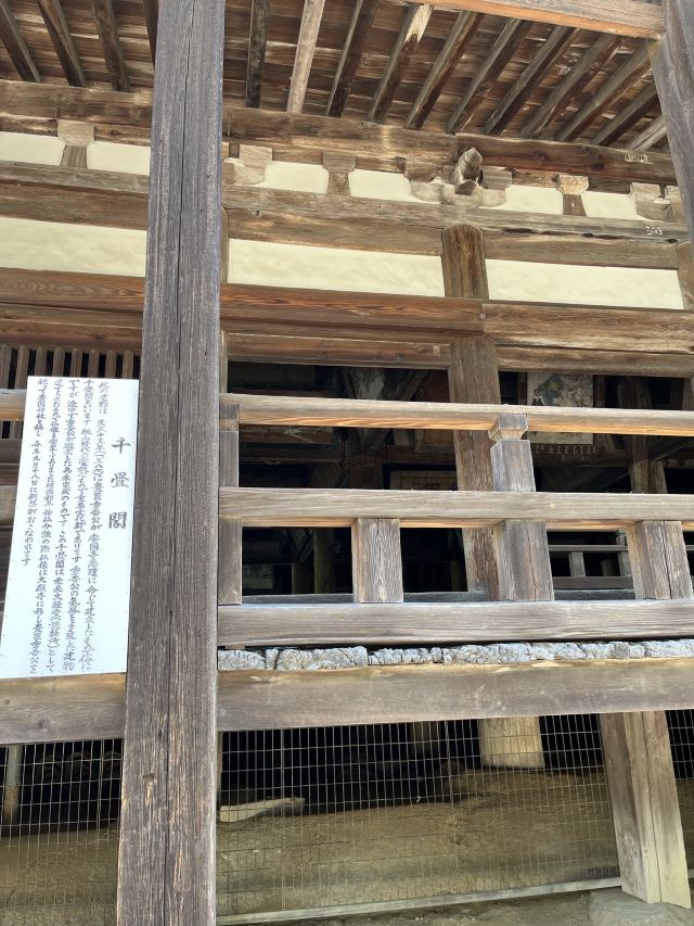 宫岛的千叠阁位于五重塔旁边,是1587年丰成秀吉为了供奉战死者,每月一次诵读千部佛经,命政僧安国寺惠琼建立的大经堂。这是岛内较大的建筑,因为有857张榻榻米的宽度,所以被称为千叠阁。不过,因为秀吉突然死亡,千叠阁的工事中途终止,至今仍保持着当时未完工的状态。