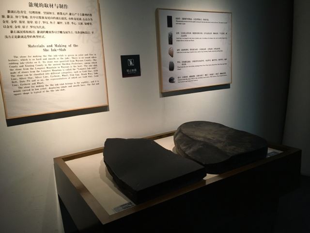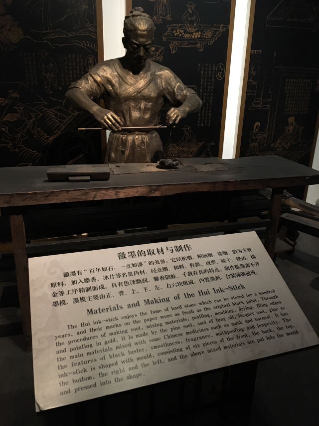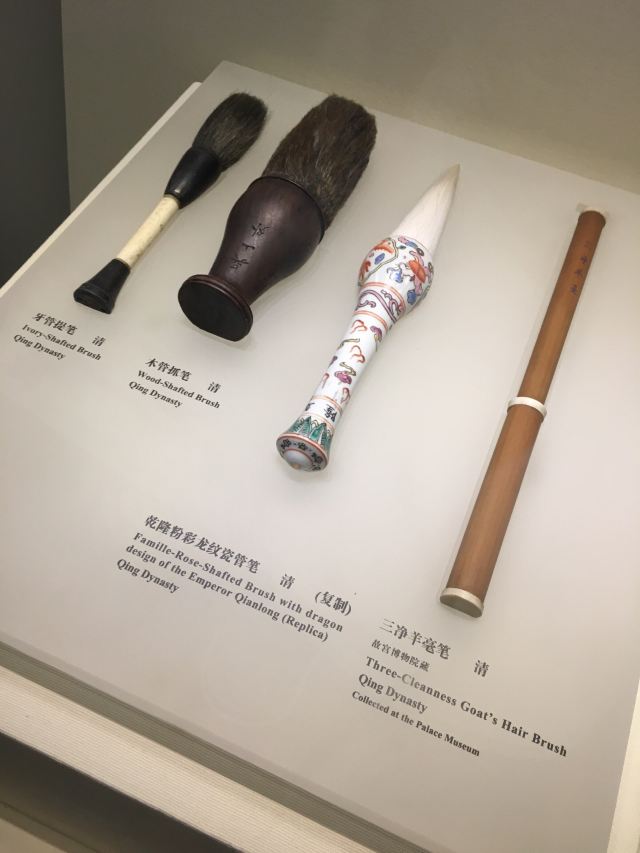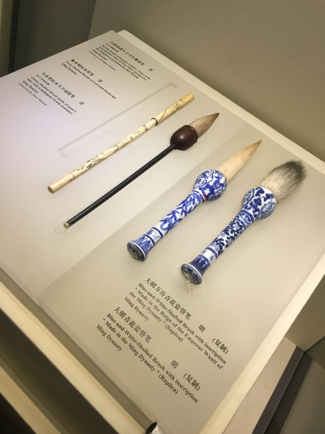 有个专门的安徽文房四宝的展厅,笔墨纸砚,涨姿势~贴金雅黄扇面笺,徽墨,歙砚……随着历史的发展,毛笔的式样也不断的变化。
