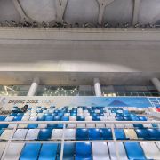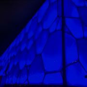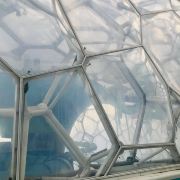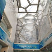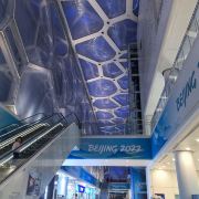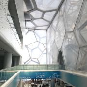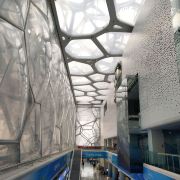 进到水立方(国家游泳中心)内部,阳光透进来,才发现构成外墙的泡泡不只一层,有好几层,仿佛进入了堆叠的泡泡内部,人鱼公主的童话世界。很多人看到泡泡都有戳一下的想法,水立方外墙由那么多气枕泡泡组成,却只有一个地方能满足游客想知道泡泡是硬还是软的想法,那就是位于二层东南角170平方米的“泡泡吧”,别的地方都是不能触摸构成泡泡的这种特殊膜结构的。在“泡泡吧”也请轻轻触摸它们,爱护水立方。