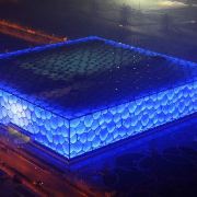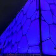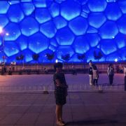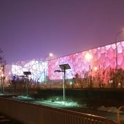 晚上水立方会亮起主打色为蓝色的灯,不时变换色彩,与旁边鸟巢(国家体育场)的红色灯光相映,好像“冰火二重天”,可以来拍摄夜景,水立方差不多晚上21:30-10:00左右关灯,只看夜景不去内部参观的也别来太晚了。