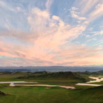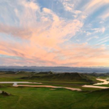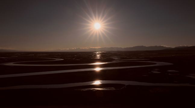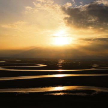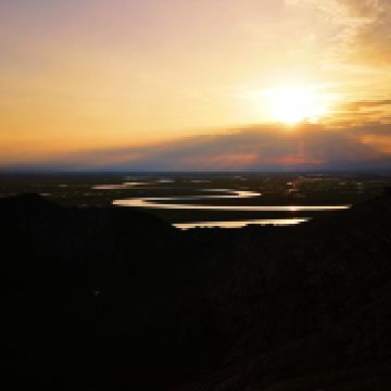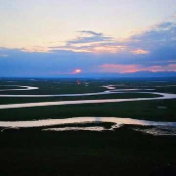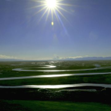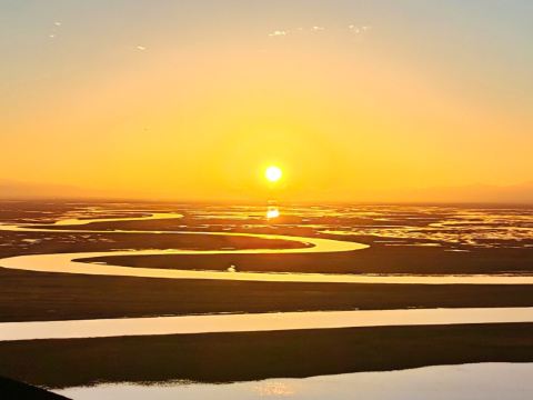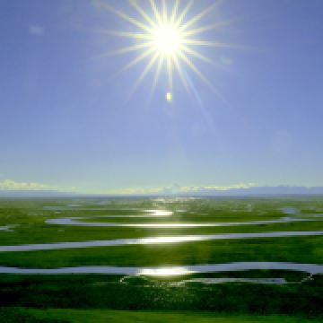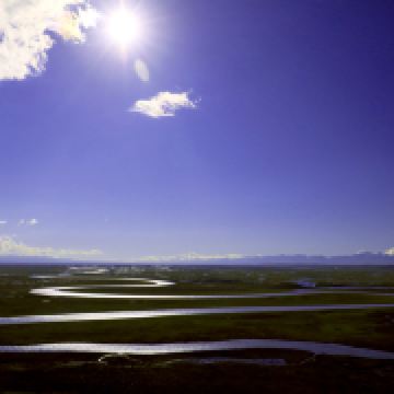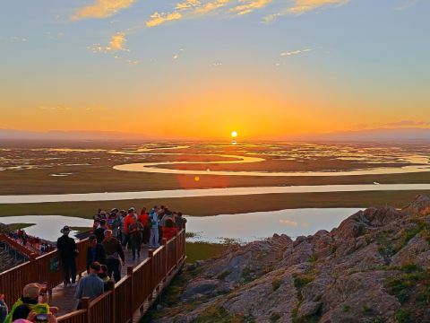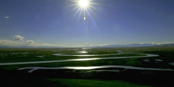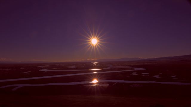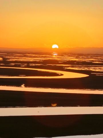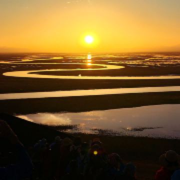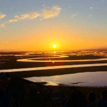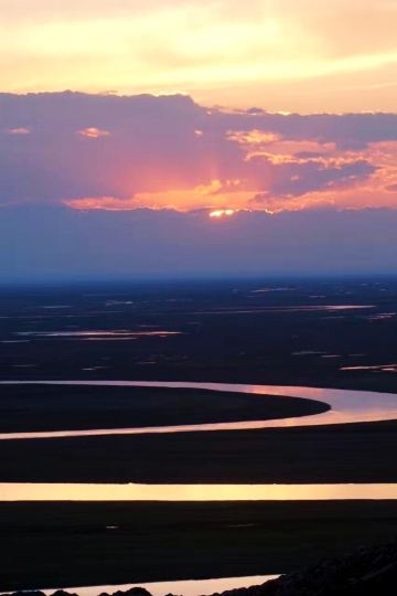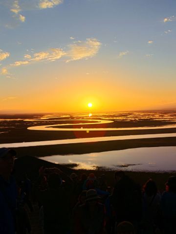 站在天鹅湖畔巴西里克山顶眺望,古老的开都河从天边缓缓向你走来。这就是“此景只应天上有,人间能有几回现”的九曲十八弯。它像是泉水和雪水汇聚而成的仙女的飘带穿过天鹅湖,更像是上苍为巴音布鲁克景区这个翡翠王国披上的圣洁的哈达。当夕阳从云缝中把万道霞光射向草原,落日摇金,蜿蜒如蟒的九曲十八弯就映出了后弈射下的那九个太阳。