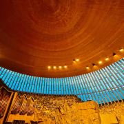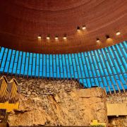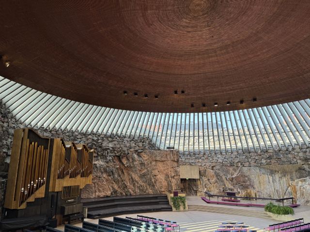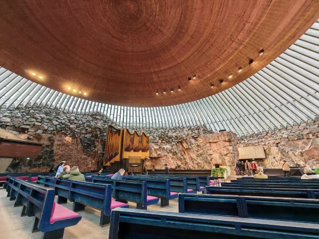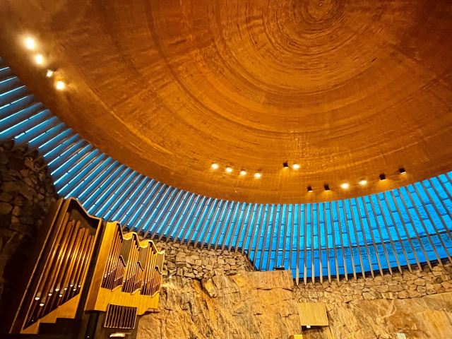 教堂入口设计成隧道,内部墙面仍为原有的岩石,整座教堂如同着陆的飞碟一般,非常奇特。屋顶采用圆顶设计,有一百条放射状的梁柱支撑,同时镶上透明玻璃,有了自然采光后丝毫感觉不到身处岩石内部。