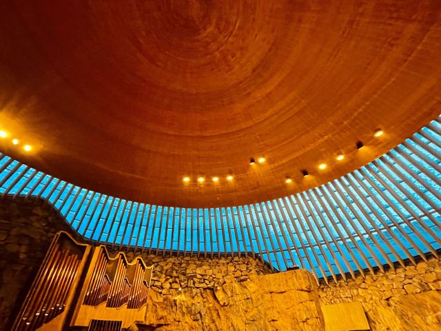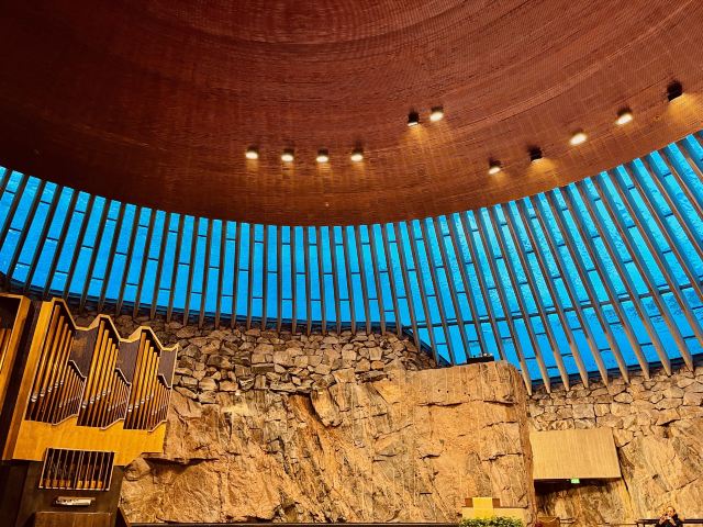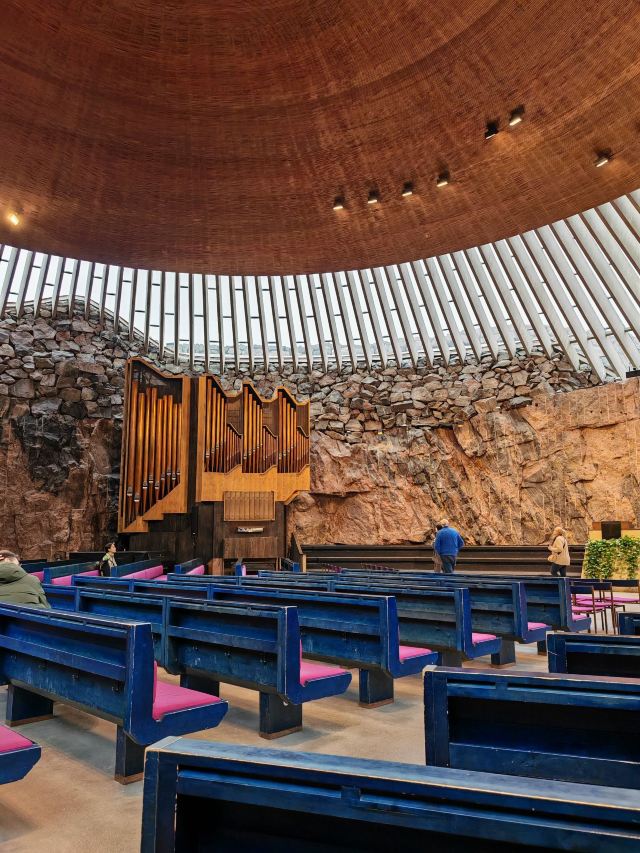 当你站在教堂外,映入眼帘的是一块巨大的岩石,看不到一般教堂所具有的尖顶和钟楼,甚至都注意不到教堂的所在,只有一个直径20多米的淡蓝色铜制圆形拱顶暴露在岩石的上面。这是因为教堂修建于一块巨大的岩石中,将岩石挖开后于上方修建了玻璃顶棚,实现自然采光,而教堂的外墙就是岩石本身。
