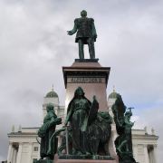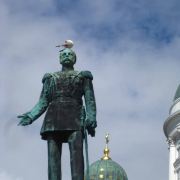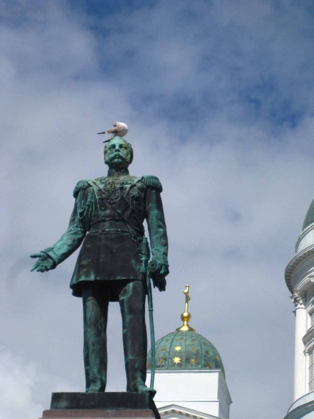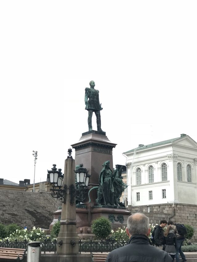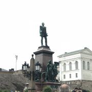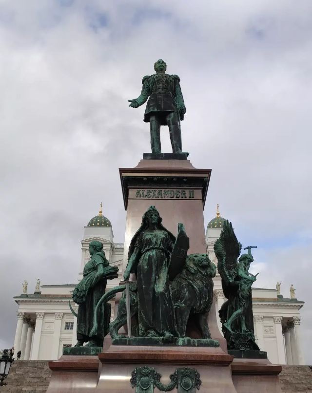 教堂前有一座俄国沙皇亚历山大二世雕像,芬兰在13世纪至19世纪初,曾被瑞典侵占600年。1808年俄国出兵进攻瑞典,迫使瑞典退出芬兰。芬兰从此成为俄国辖下的一个自治大公国。芬兰人对这位沙皇非常尊崇,在1894年树立了这尊沙皇亚历山大二世铜像,并保存至今。