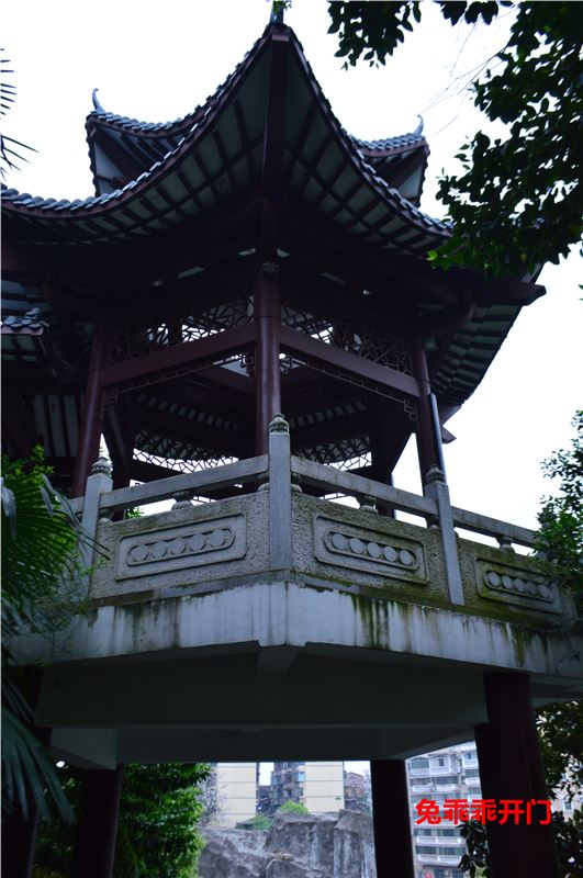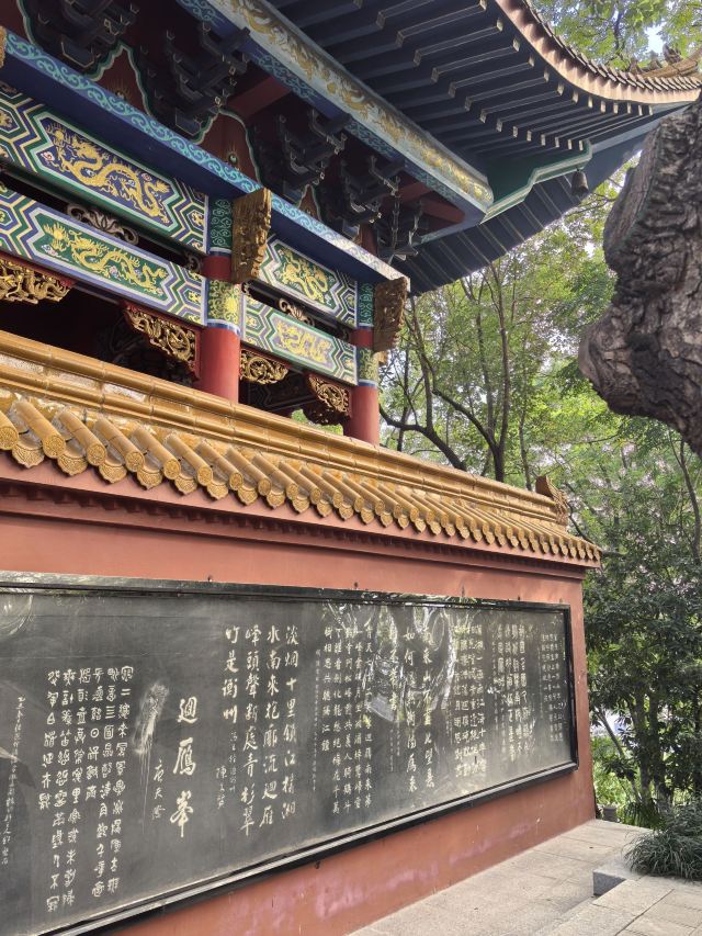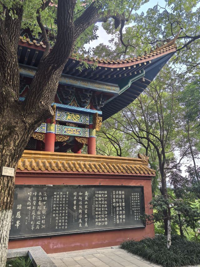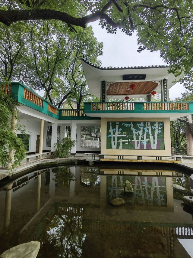 ⑥此君轩:始建年代不详,原轩已无存,现存建筑为高颜值的双层廊轩,建国后的建筑风格,亭、台、室、廊、桥、梯6元素均有,构思巧妙,色调淡雅、韵味十足,一层内部挂有王夫之所著《摸鱼儿•潇湘小八景词》,其中“回首处,犹记当时踪迹,危亭斜倚南陌。满城春滑笙歌腻,销尽银红夜色”一句写的是自己的出生地,即回雁峰下的王衙坪。