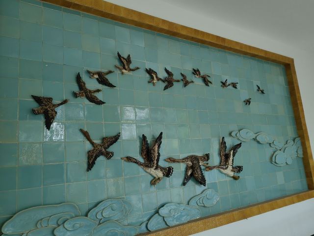 ②平沙落雁:进南门后的石桥、木栈水景,配以旁边橙、黄、绿3色树叶颜值不错。水景是浓缩版的潇湘八景之一“平沙落雁”,即秋天南飞的大雁在衡阳的湘江堤岸嬉闹觅食的场景。