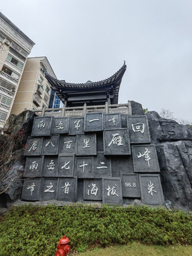 ①南门牌坊:5洞灰身蓝顶的石牌坊,宽敞壮观,上刻“南岳第一峰”。南侧机动车道旁的石栏上,刻有历代为衡阳市各地标景观(回雁峰、石鼓山等)所作的诗词,如清代段献王的《登回雁峰》、清代吴斗山的《游石鼓山》等。