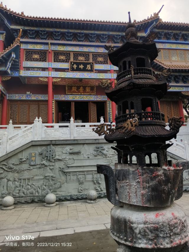 1、雁峰寺位于3A景区回雁峰。回雁峰是衡阳市区内的小山,南岳衡山(5A)72峰之首,顶峰海拔96.8米,峰名由来一说是古人认为北方大雁南飞过冬时飞到此处为止不再向南;二说是因为其山形如大雁展翅飞翔。回雁峰是清代著名思想家王夫之的出生地,风光秀美、舒适宜人,更像一个便民公园,占地2.1平方公里,面积不大,分为回雁阁、王船山出生地纪念馆、雁峰寺3部分,是健身养生、观景摄影、古装写真、人文学习、拜佛祈福的好去处。