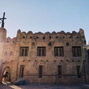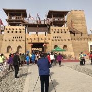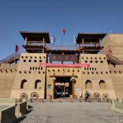 3、驿站的外观是一座宏伟神秘的西域土城,城门外有骆驼供游客骑乘拍照,城门处的彩绘壁画很漂亮,并栽有一棵挂满红色祈福带的树。进入城内后正对的是室内博物馆的入口,单向路线不走回头路。室内的“交河驿展陈艺术馆”用图文、蜡像、布景、视频等形式介绍了交河驿的历史沿革和职能。驿站区域包括: