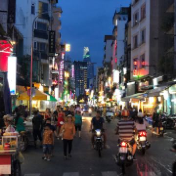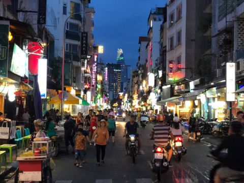 老街的午夜,更是灯火璀璨,夜色阑珊,老街上的商店也是胡志明市主要的购物地点,这里的旅游工艺品很多,可以在晚上慢慢逛,仔细挑选。入夜的时候,很多睡不着的背包客便出来闲逛,找咖啡馆、找小吃店、找果汁店,很热闹。