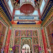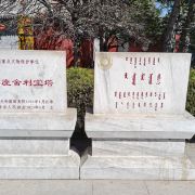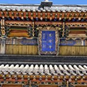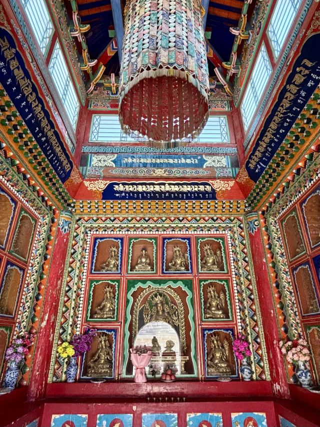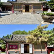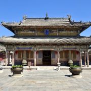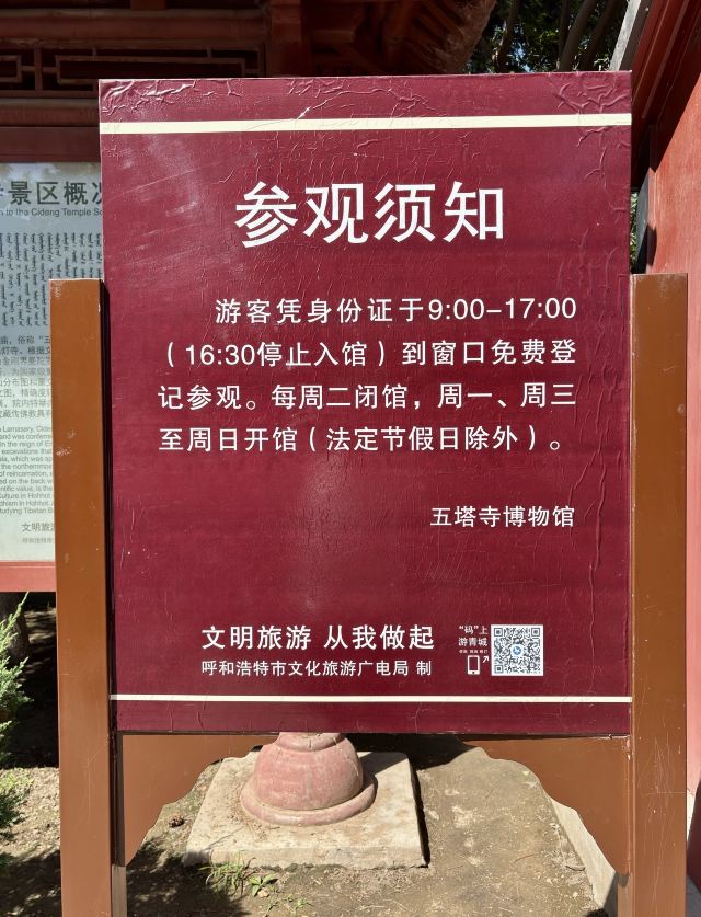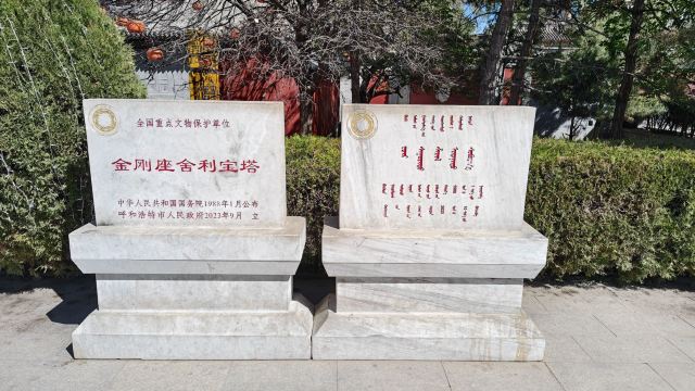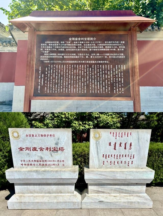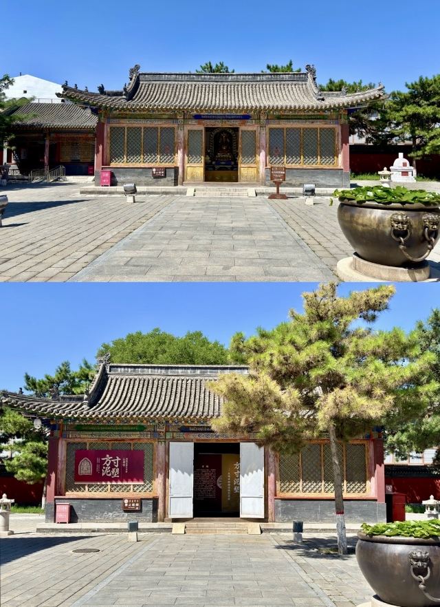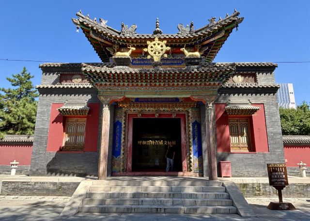 穿过三世佛殿后来到中间的院子,对面的建筑上清晰大字写有“呼市召庙文化展”。在召庙文化展建筑内部,左侧的墙上挂有历史上的宗喀巴等人像,右侧列有我国现存金刚座舍利宝塔召庙图,体现了呼和浩特召庙文化的渊源流长。