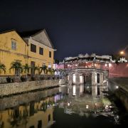 日本廊桥建于1593年,起初由日本人修建,在中国明朝时由中国人重建并立碑为证。木头的红漆已经脱落,和众多的中国古桥差不多。有意思的是桥上一端由猴子看守,一端由狗看守,据说是猴年开工,狗年完工。桥宽不到两米,两边是长有铁锈的圆形铁条护栏,没有特别装饰的雕刻。廊桥中段有展览室,明黄的法式建筑和高大的椰子树倒映在河面上,连同着夕阳的余晖,安静而和谐。