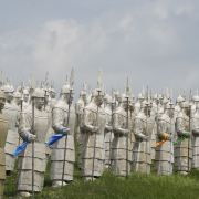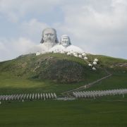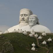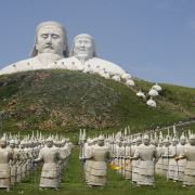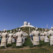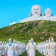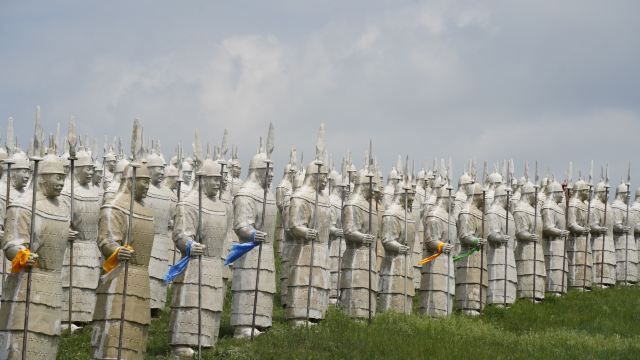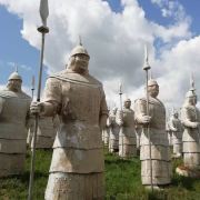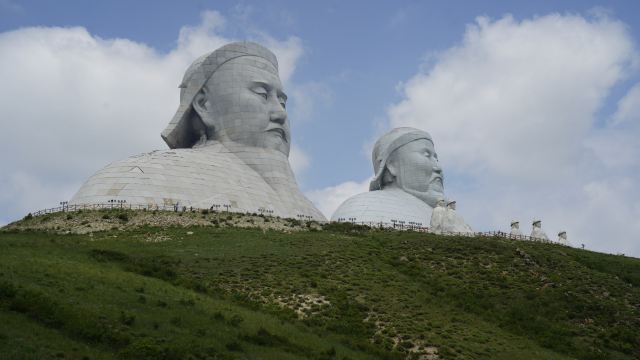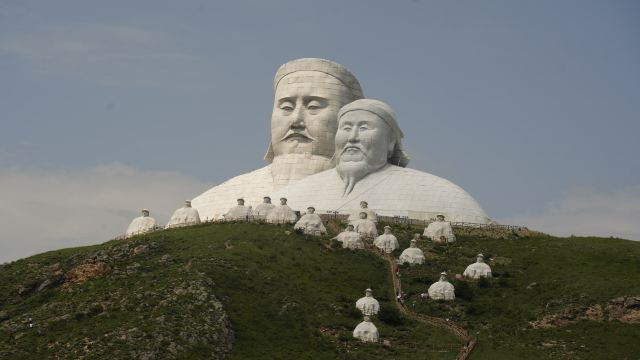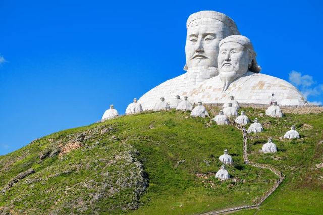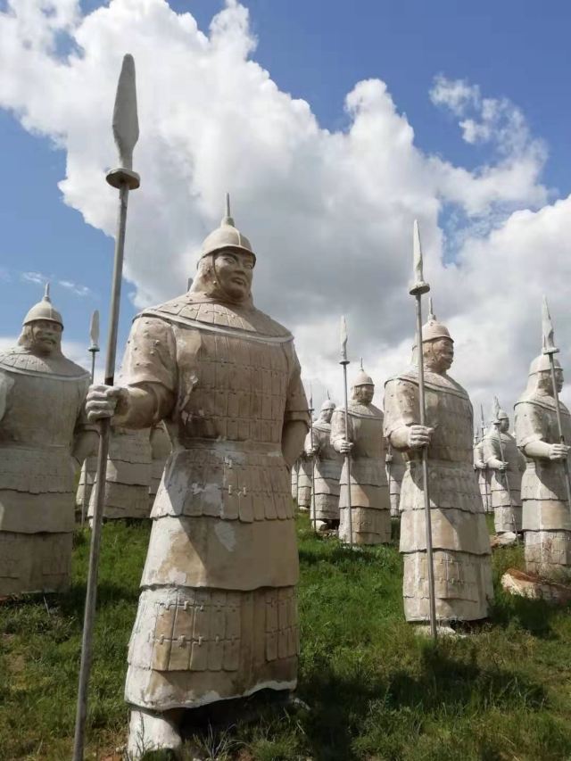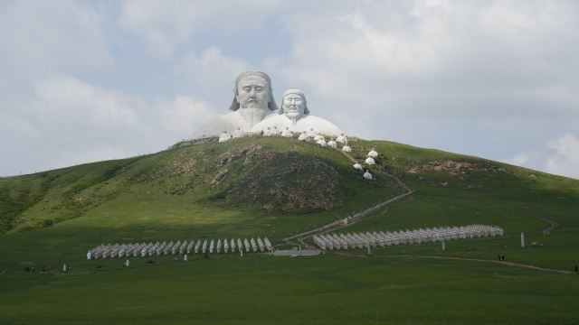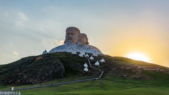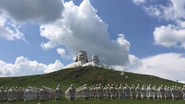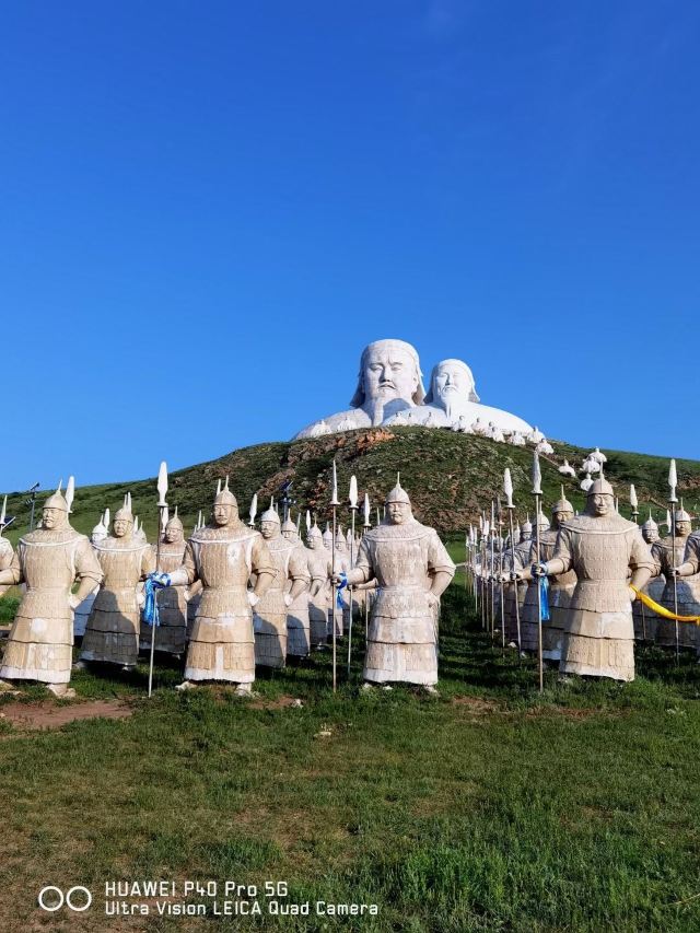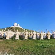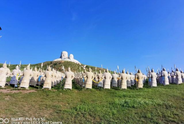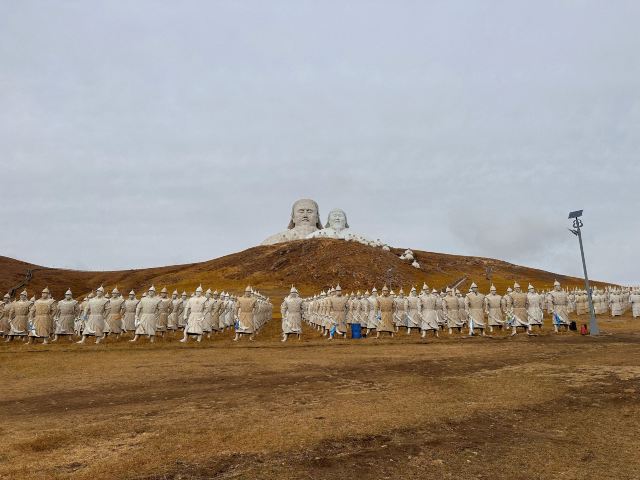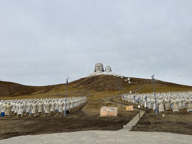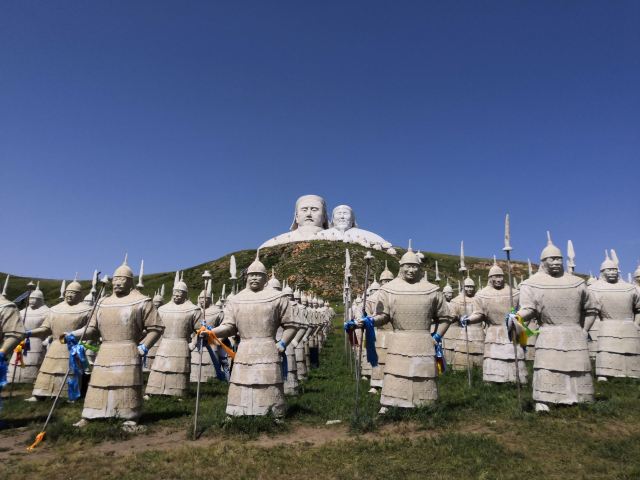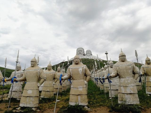 景观气势恢宏:山顶50米高的成吉思汗巨像和30米高的忽必烈像傲立云间,山腰还有16位蒙元帝王塑像,山脚下800尊3米多高的蒙元兵阵武士塑像如天降神兵,整个雕塑群规模宏大,给人强烈的视觉冲击,被誉为“草原上的兵马俑”。