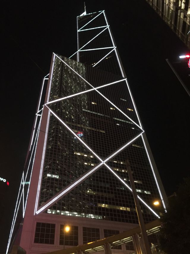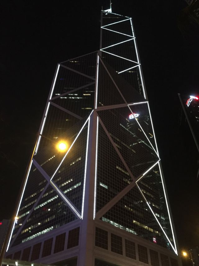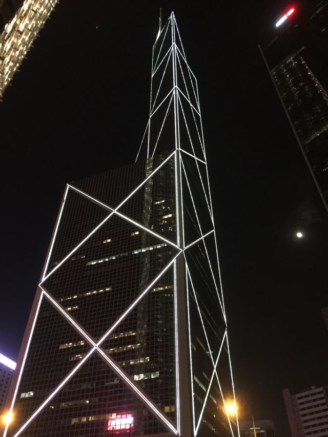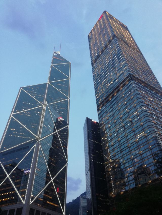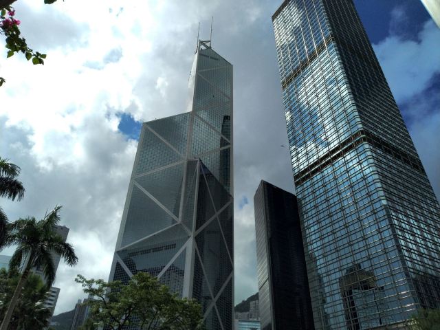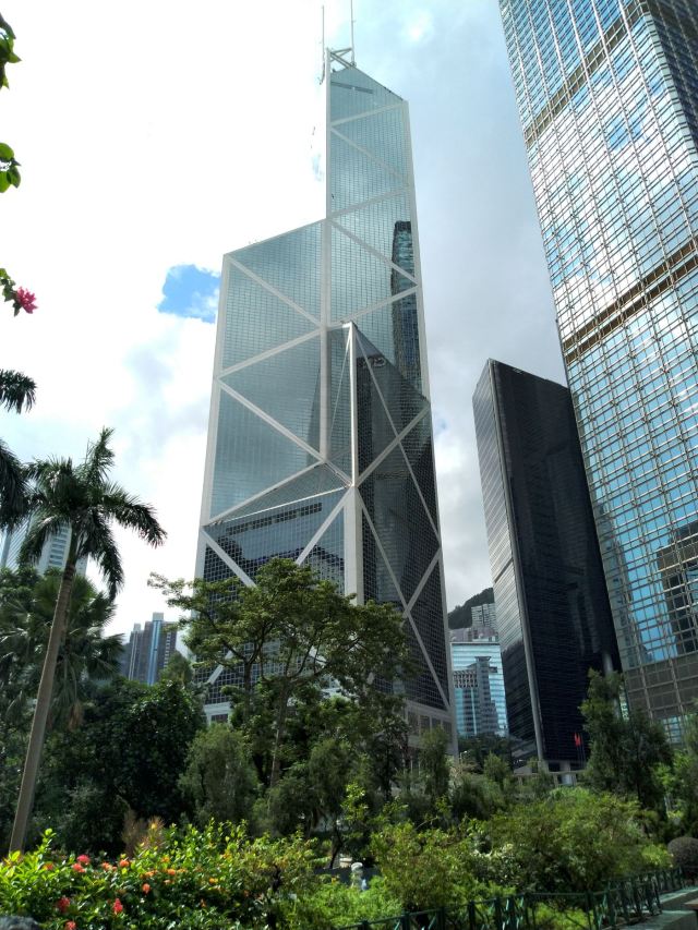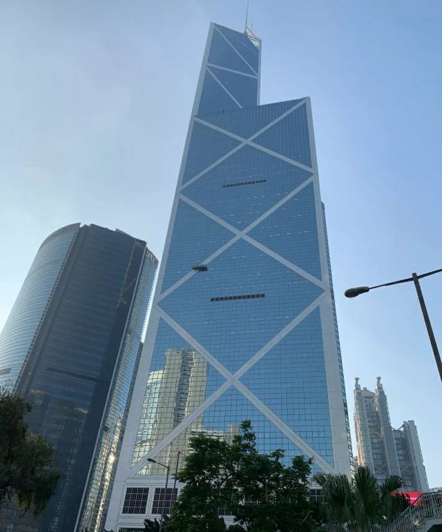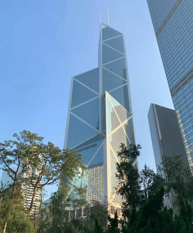中银大厦是一栋由几组三角形组成的摩天大楼,它就是当地的标志性建筑之一,中国银行大厦,独特的造型寓意“节节高升”。