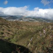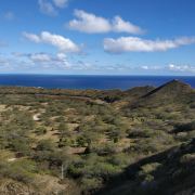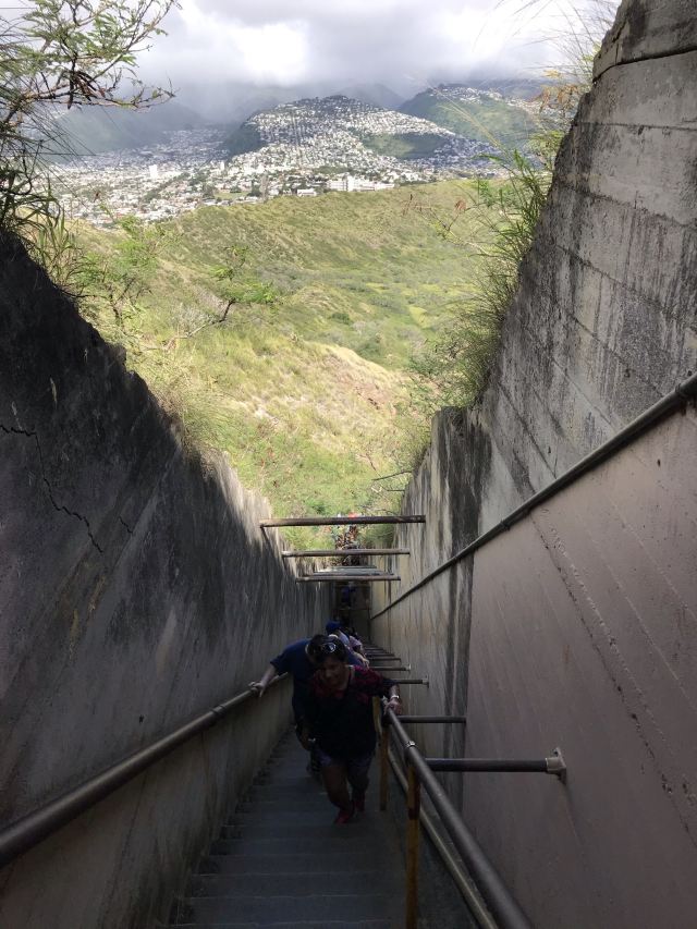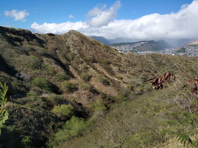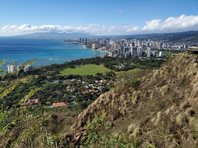 站在山顶可以360度环看整个檀香山市美景,还可以远眺眼前一望无际的湛蓝色太平洋,以及不远处威基基海滩的美丽弧线。换个角度还可以看到整个火山口的样子,而停车场就在其中。在山顶看美景的同时,还能看到之前走过的步道上陆续不断的有人继续攀登上来。