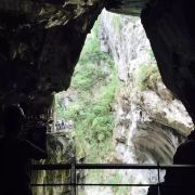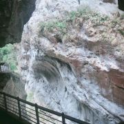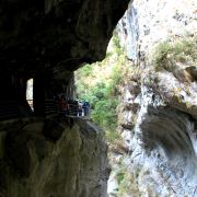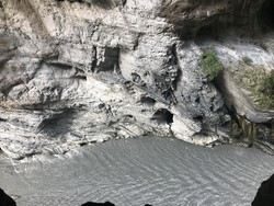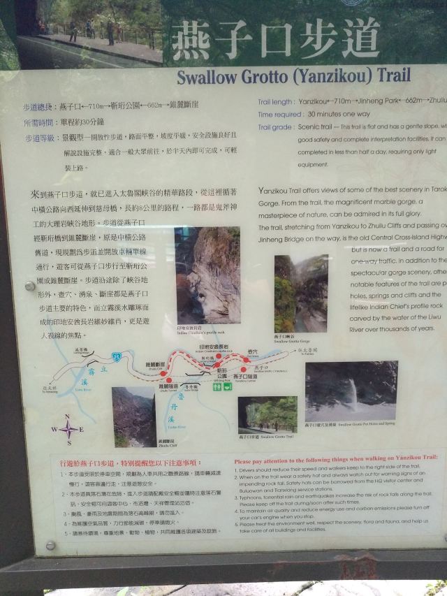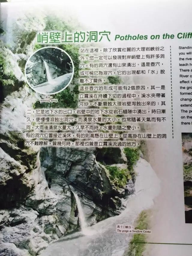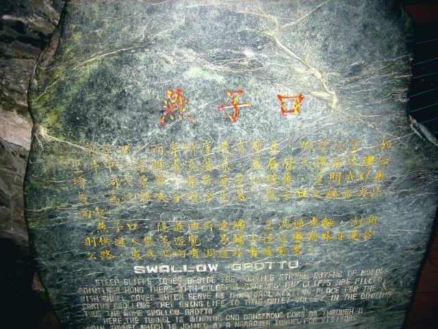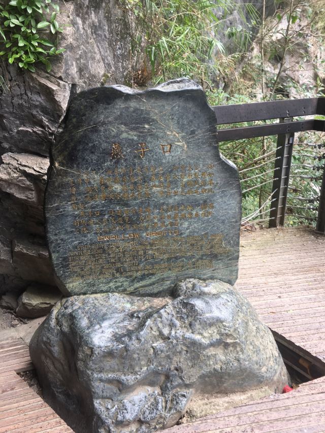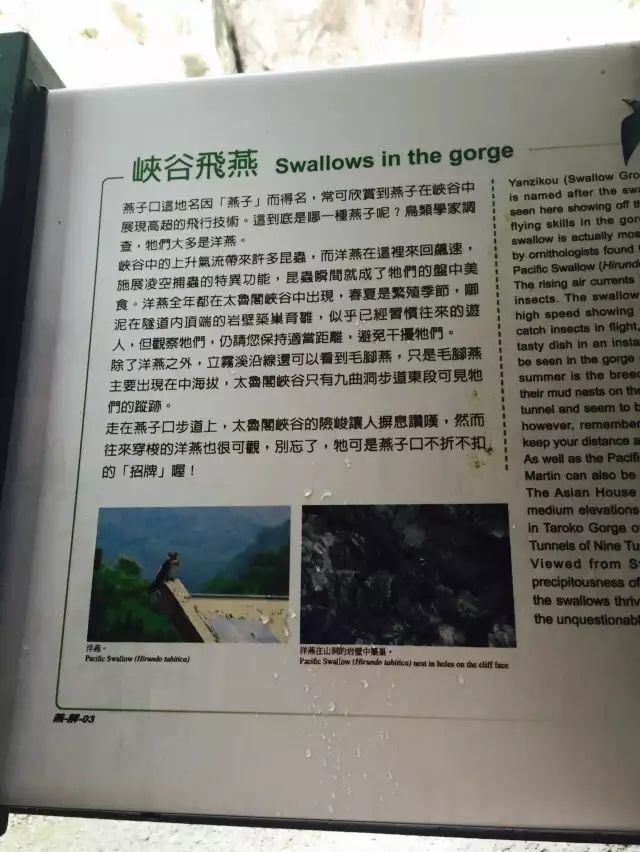 燕子口为太鲁阁峡谷一段峭壁,弯曲高耸的峡谷、浑厚雄伟的断崖峭壁、曲折山洞坠道。站在公路护栏边上,对面的山壁近在咫尺,岩壁上因石灰岩受溪流的长期侵蚀,较松软的岩层逐渐形成洞穴,燕子就在这些天然洞穴中筑巢而居。早年因常有雨燕、洋燕在空中成群觅食,形成“百燕鸣谷”的奇景,因而博得燕子口的美名。可惜的是,因游客过多,如今燕子已被车声及人声喧哗吓走了,只有偶尔还有几只穿梭在附近,独留下岩壁上的洞内奇观,徒增遗憾。