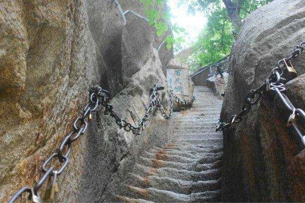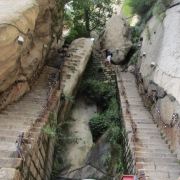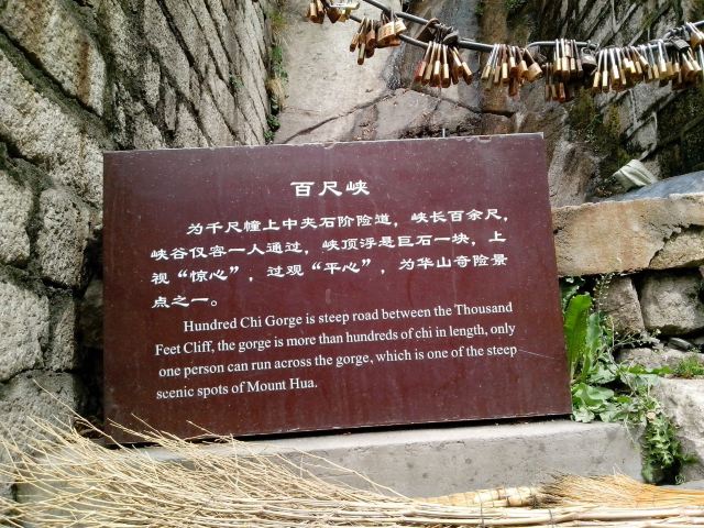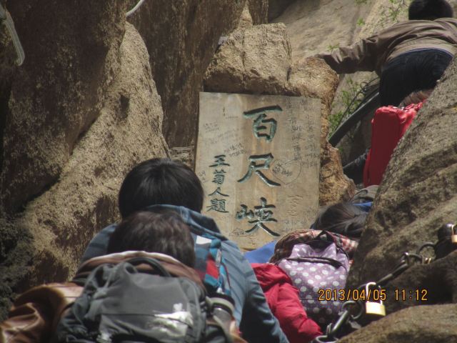 百尺峡位于千尺幢北,是登华山的第二个险境。“百尺峡”也叫“百丈崖”,两壁欲合,却被飞来的两颗石块从中撑开,人从石头下钻过,胆战心惊,生怕石块从两壁间掉下来,这就是“惊心石”。
