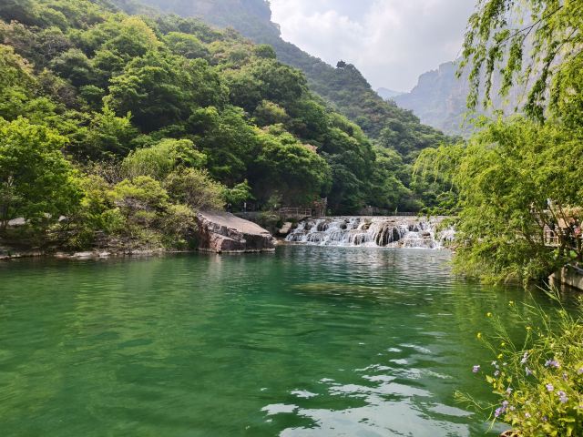 初见宝泉,便一眼沦陷在浑然天成的山水画卷里。踏入园中,满目皆是治愈绿意,远山连绵起伏,岩壁浸染天然丹霞肌理,赤红崖壁错落交织,与山间层层叠叠的浓绿草木相映成趣,撞出独属于太行山野的浪漫底色。最动人的当属澄澈碧水,游龙湾蜿蜒流转,一汪潭水澄澈如通透翡翠,波光粼粼铺满山谷,水底圆润鹅卵石清晰可见,天光云影轻轻倒映水面,风过处涟漪轻漾,揉碎漫天光影,随手驻足抬眼,皆是无需滤镜的自然大片,氛围感恰到好处。