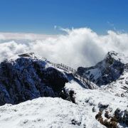 轿子雪山位于昆明市北侧,主峰海拔4223米,是一座冬季积雪的山峰。这里自然景观独特,山间有大小不等的高山湖泊、草甸,每年春天还有几十种杜鹃花盛开,非常漂亮。冬季时,这里还是很多驴友徒步登山、攀冰的乐园。