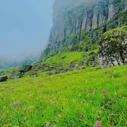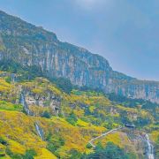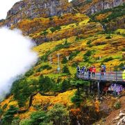 5分 超棒轿子雪山座落于昆明禄劝县转龙镇,距昆明一百多公里。有一条旅游专线,从昆明直通山下,但路况不好,至少需3小时车程。 我们提前一天到达山下的转龙镇,第二天一早,开车进入景区后,换乘景区大巴,一路盘山道,蜿蜒向上。 大巴开了20多分钟,停车点的海拔已经到了3500多米,而我们的乘车点才2000米左右。 沿着栈道,走了一个多小时,路过了几个景点,来到一个叫精怪塘的景点,这是半山腰的一个草坪,其中一汪清泉,前方千丈山崖拔地而起,巍峨险峻,横绝眼前,峰峦叠嶂,高耸入云,这是佛光崖,轿顶还在前面,更高。 顺着佛光崖的脚下,继续向前,海拔越来越高,眼看都4000多米了。继续走了个把小时,绕过佛光崖,又来到一个大草坪,大概3、4百米长宽,两侧都是悬崖绝壁,崖下浓雾沉沉,深不见底,偶见巨峰怪石,不禁让人头皮发麻,不敢近前。正前方,一座山峰横生矗立,如巨石屏风,截断前路,贯通天地,这就是最高峰,轿顶。沿着曲折陡峭的栈道,开始攻坚。这段路程较为难走,有段栈道几乎垂直向上,我几乎不敢向下看。来到山脊线,又要斜上登顶。这段路也很险,栈道狭窄,只容一人通过,两侧就是悬崖峭壁,尤其是来路的另一侧,完全是万丈深渊。小心翼翼通过后,终于登顶,4223米。 原路返回到佛光崖底部,我们选择了另一条下山的路。这时,远望轿顶虽然依旧浓雾弥漫,但这里已经清爽起来,高山草甸的风光一览无遗。湛蓝的天,洁白的云,澄清的湖水,巨大的山石,宽阔的草地上,无数红的、黄的、紫色的小花遍地开放,还有慵懒的羊群和牛群,悠闲的吃着草,不时咩咩、哞哞的发出声音,很让人心旷神怡。