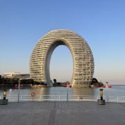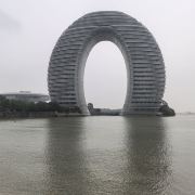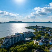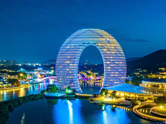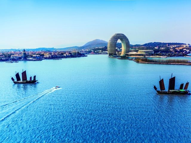 湖州是太湖旅游度假区的主要景区,湖州的地标性建筑,月亮湾造型独特与清澈的湖水相伴景色宜人。