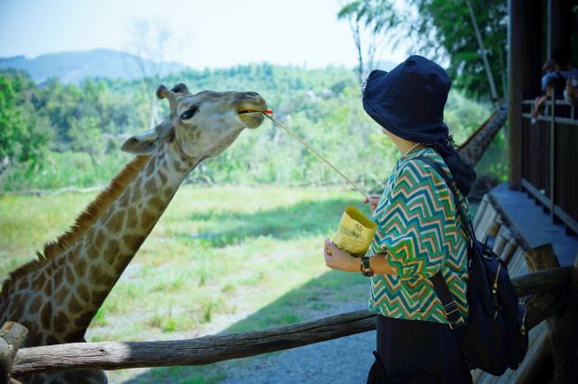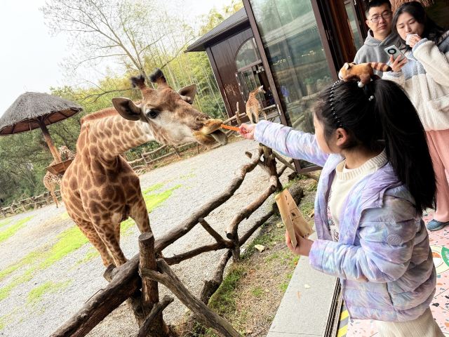 长颈鹿互动平台:园内已经有8只长颈鹿了并且以后数量还会增加,在互动大厅里可以近距离和它互动,还能喂它吃东西哦~