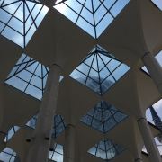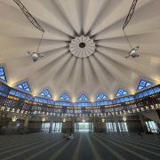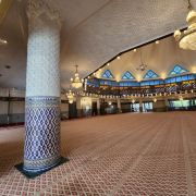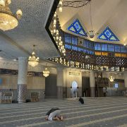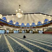 再进去就是宽阔、高大的祈祷大厅,可以同时容纳约8000人在此祈祷。大厅的屋顶是由49个大小不等的圆拱组成的,圆拱直径有45米,呈18条放射星芒。在祈祷大厅的旁边就是大尖塔,塔尖的形状像火箭,高73米,有电梯和楼梯通到上端,但是否开放,是否可以上去参观则需要当场询问工作人员。