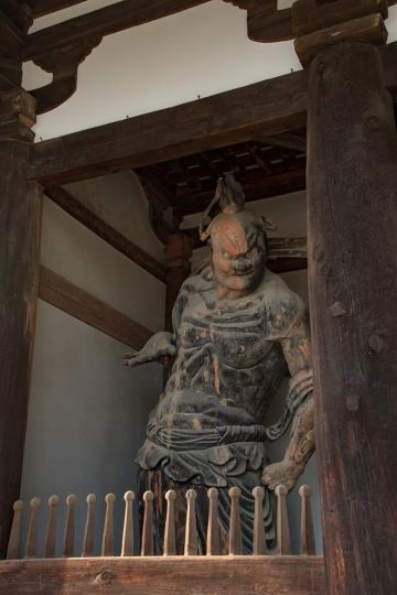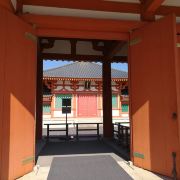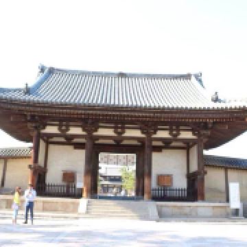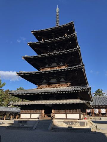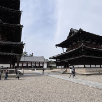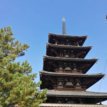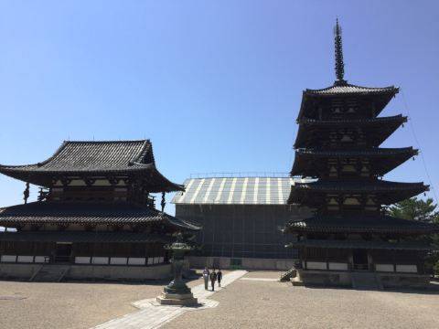 法隆寺又称斑鸠寺,位于奈良县生驹郡斑鸠町,据传由日本历史上非常受赞誉的圣德太子始建于607年,是日本早期的世界文化遗产。寺中的西院伽蓝是世界上非常古老的木造结构建筑群。寺内还保存着大量自飞鸟时代以来的绘画、雕刻、佛像等日本国宝和重要文化财产。法隆寺占地面积约19公顷,分为东西两院,并种满了参天大树。东院伽蓝有梦殿等建筑,西院伽蓝有金堂、五重塔、山门、回廊等木造结构建筑。在法隆寺的门前有一条绿树成荫的长长参道。来到南大门后,由此进入法隆寺,继续往前走便到了中门。中门是西院伽蓝原本的入口,其左右站立着造于奈良时期的金刚力士,是日本非常古老的造像。为了保护遗迹,这里已经禁止进出,你需要绕到回廊的西南角进入西院。在西院的东侧你会看到金堂,西侧则是五重塔。
