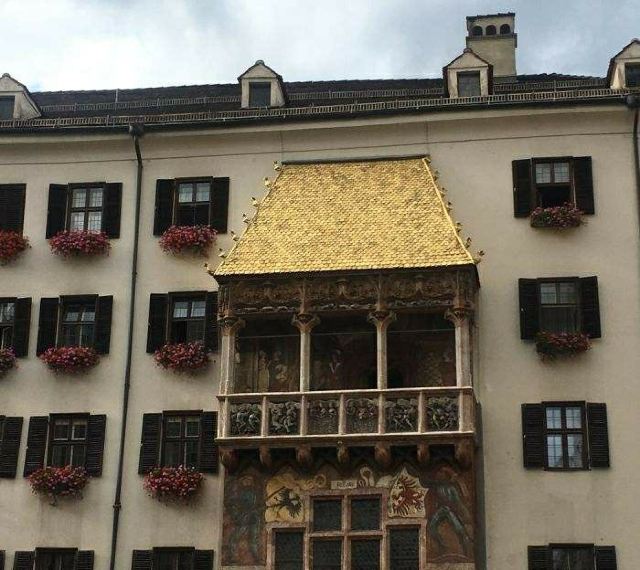 黄金屋顶是奥地利因斯布鲁克的地标,由神圣罗马帝国皇帝马克西米利安一世建于1500年,装饰着2657块镀金铜瓦。阳台上的浮雕刻画纹章、符号,以及他生活中的其他人物。