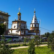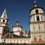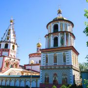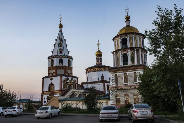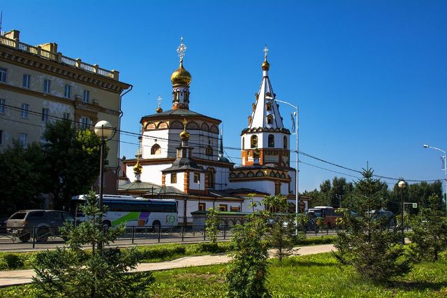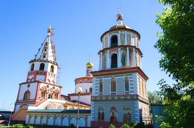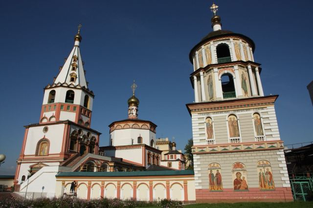 主显节大教堂坐落于安加拉河畔,是伊尔库茨克古老的建筑。教堂外观白色亮洁,各层由长方形、圆柱形、三角锥形组合在一起,仿佛是积木搭起的精美玩具,旁边还有两的金色的洋葱头形状的穹顶衬托着,耀眼华丽。教堂保持了18世纪东正教教堂的风格,外墙上的壁画栩栩如生。主显节原本是东方教会庆祝耶稣诞生的节日,因此有些译名称之为“上帝产生大教堂”,这个名字从侧面也说明了这座教堂的华丽。如果赶上下雪,教堂和积雪交相辉映,周围的树上还会形成美丽的树挂,非常值得观赏。